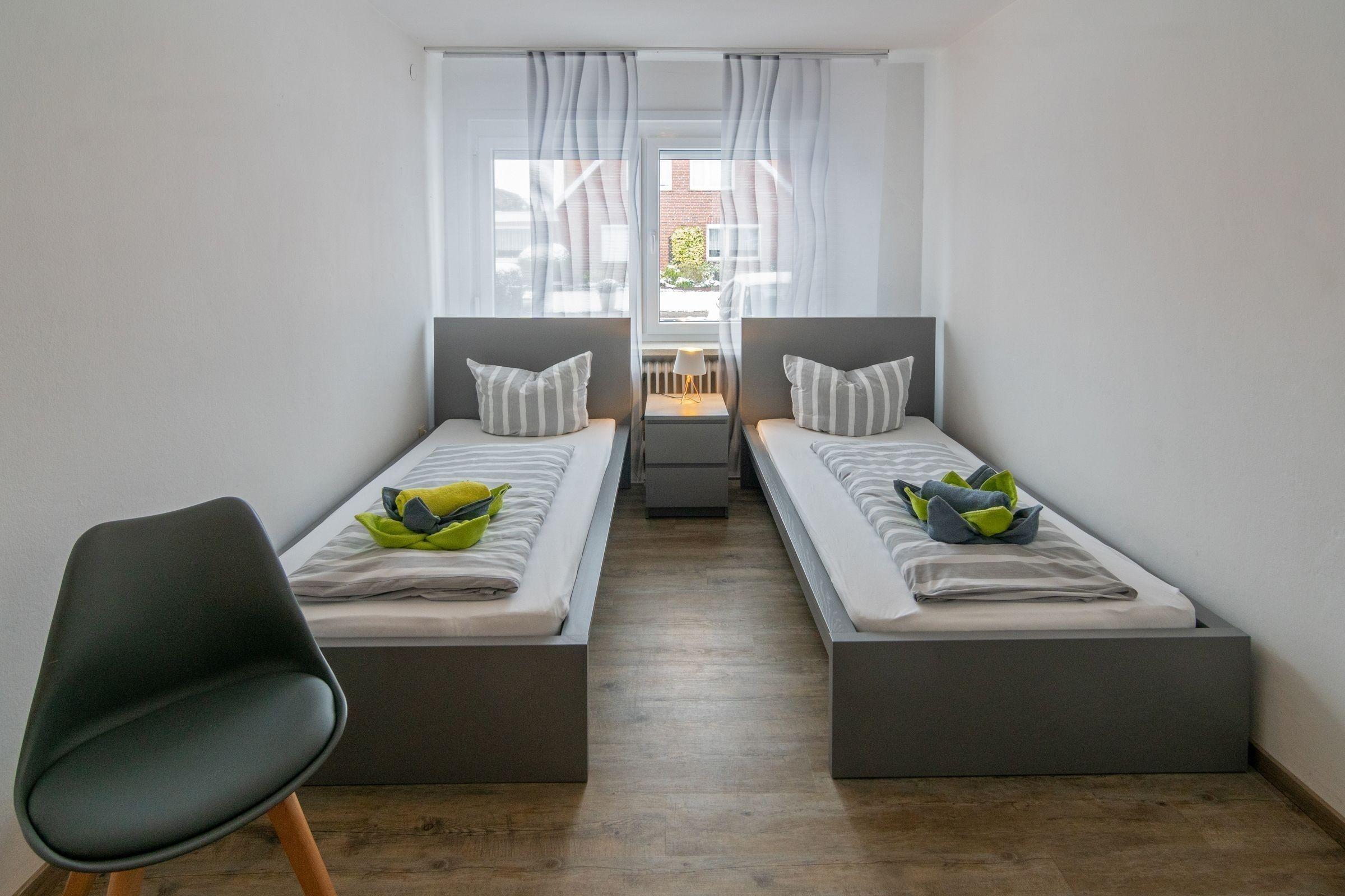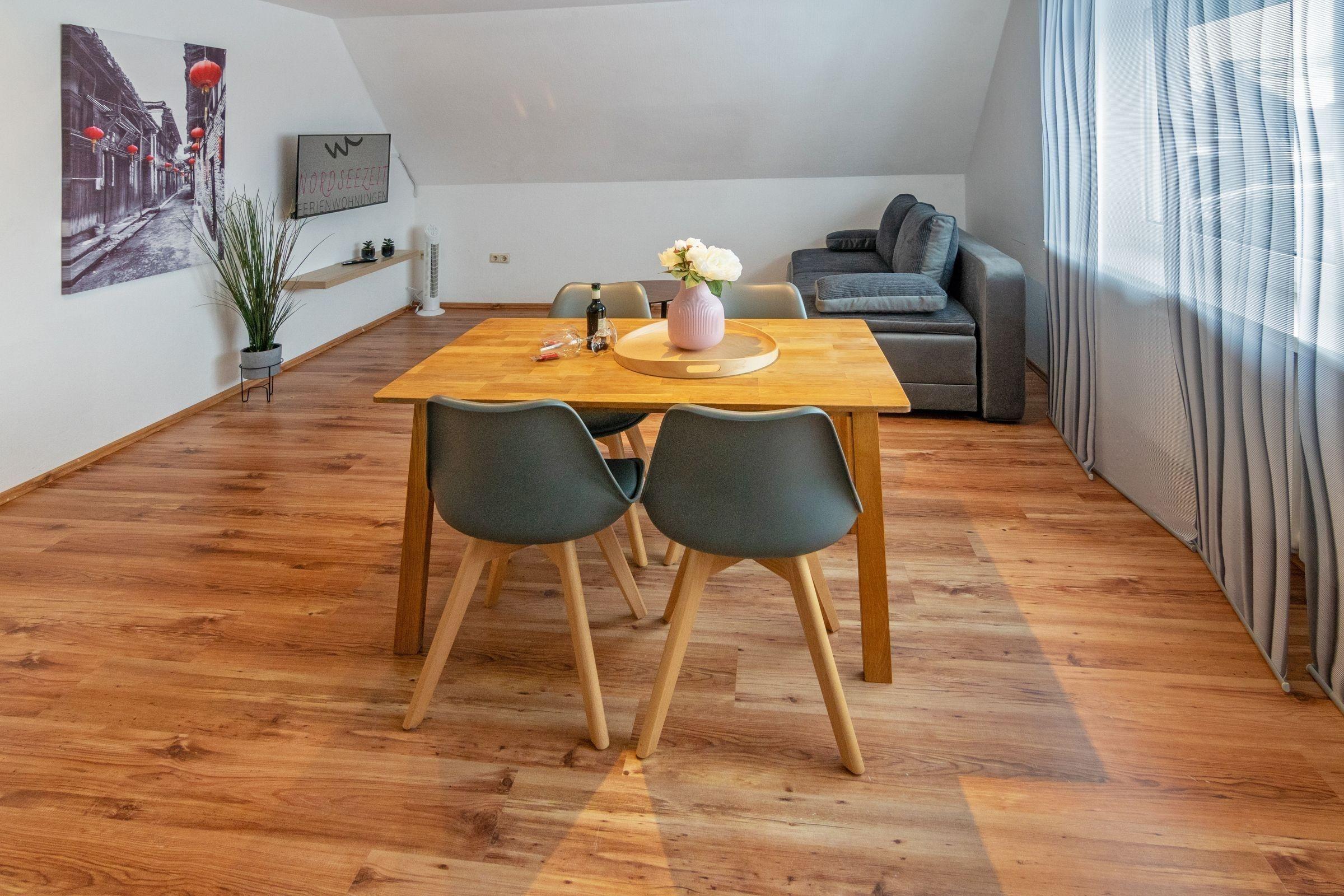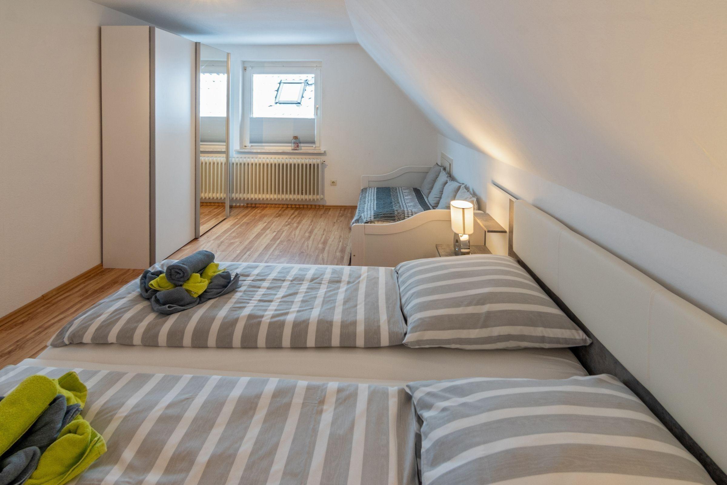 Die Ferienwohnung bietet eine großzügige und allergikergeeignete Ausstattung, die für entspannte Urlaube sorgt. Sie verfügt über 4 Schlafzimmer, darunter 2 Doppelbetten, 2 Einzelbetten und ein Kinderbett sowie eine Schlafcouch im Wohnschlafzimmer. Für die Zubereitung von Mahlzeiten steht eine separate Küche zur Verfügung, die mit einem Geschirrspüler, Elektro- und Gasherd, Backofen, Mikrowelle, Kühlschrank und Gefriermöglichkeit ausgestattet ist. Kaffeemaschine und Toaster sorgen für zusätzlichen Komfort. Die 2 Badezimmer bieten eine Dusche und eine Badewanne, ergänzt durch einen Haartrockner und einen Spiegel.