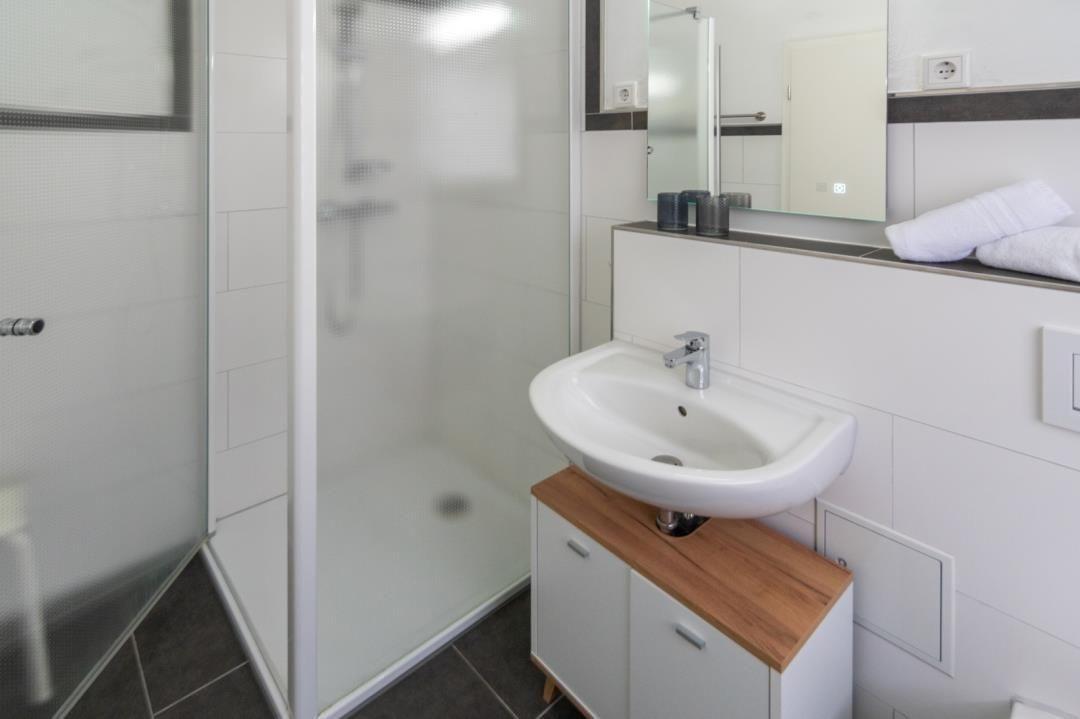 Das moderne Tageslicht Badezimmer ist gefliest und verfügt über eine bodennahe Dusche, einem WC, Waschbecken mit Unterschrank für Ihre Hygieneartikel und einem beleuchtetem Spiegel.