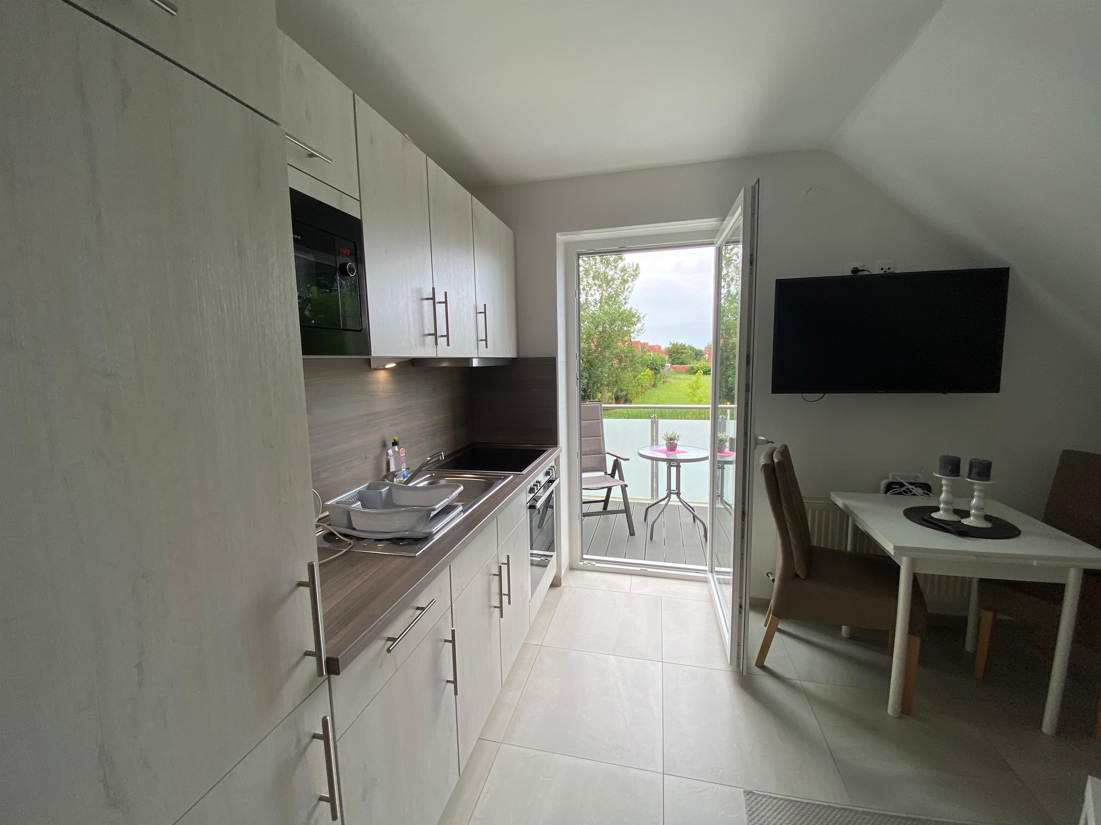 Die Wohnküche besteht aus einer gemütliche Sitzecke mit Schlafmöglichkeit für eine Personen, einem Farbfernseher sowie der Essecke für 3 Personen. Die Küche ist komplett ausgestattet mit E-Herd (Backofen und 4 Kochfelder), Kaffeemaschine, Toaster etc.