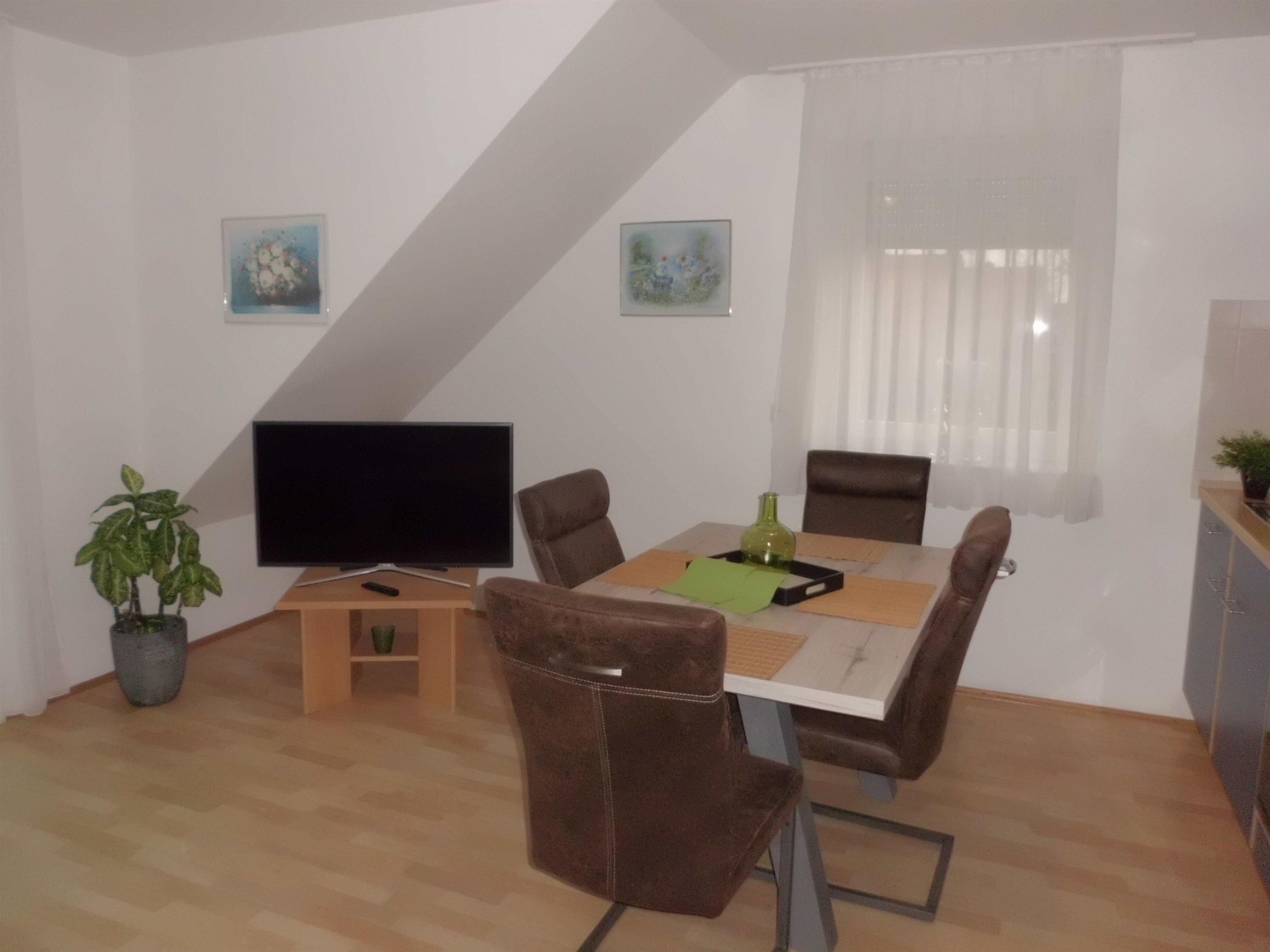 Die Wohnküche besteht aus einer gemütliche Sitzecke mit Schlafmöglichkeit für 2 Personen, einem Farbfernseher sowie der Essecke für 4 Personen. Die Küche ist komplett ausgestattet mit E-Herd (Backofen und 4 Kochfelder), Kaffeemaschine, Toaster etc. Von diesem Raum aus gelangen Sie auch auf den angrenzenden Balkon.