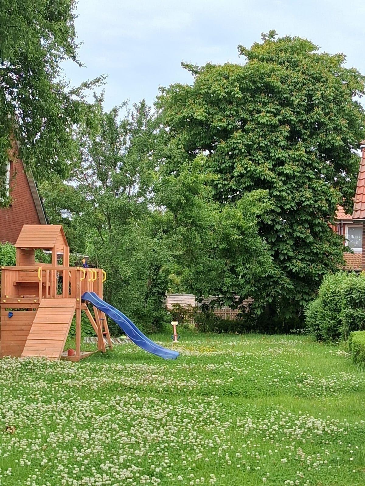 Die Ferienwohnung bietet einen privaten Außenbereich, der ideal für entspannende Stunden im Freien ist. Eine großzügige Liegewiese lädt zum Sonne tanken ein, während der Spielplatz mit Schaukel und Sandkasten kleinen Gästen viel Freude bereitet. Hier findet jeder den perfekten Ort für Erholung und Spiel in einer ruhigen Umgebung.