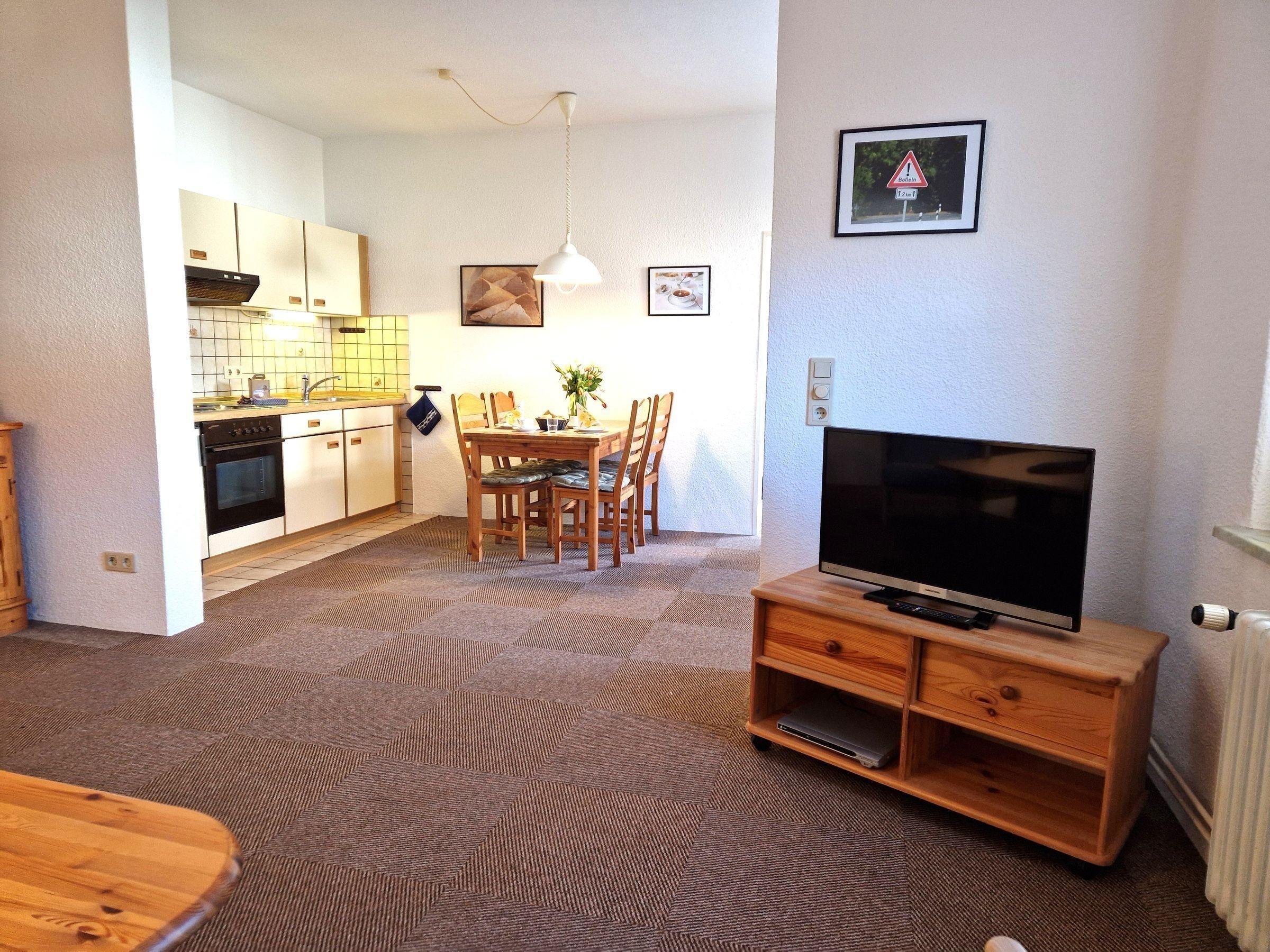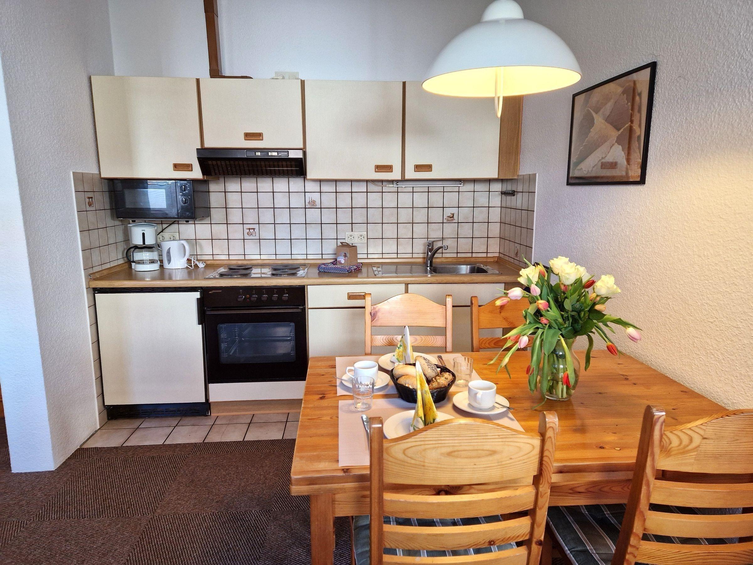 Die Ferienwohnung bietet ein modernes und komfortables Ambiente, ideal für einen erholsamen Aufenthalt. Sie verfügt über ein Schlafzimmer mit einem Doppelbett, ein Duschbad mit Fenster sowie ein zusätzliches Gäste-WC. Die offene Küche ist vollständig ausgestattet mit einem Elektro-/Gasherd, Backofen, Mikrowelle, Kühlschrank, Toaster, Wasserkocher und Kaffeemaschine. Genügend Geschirr und Besteck für angenehme Mahlzeiten am Esstisch sind vorhanden. Der Wohnbereich ist ausgestattet mit einem Sofa und einem Sessel, ideal zum Entspannen, während die HiFi-Anlage und der TV für Unterhaltung sorgen. WLAN-Internet steht zur Verfügung, und die Wohnung ist allergikergeeignet. Ein Parkplatz vor der Tür rundet das Angebot ab. Die Ausstattung umfasst zudem einen Staubsauger, Wäscheständer und eine Garderobe. Diese Ferienwohnung bietet den perfekten Rückzugsort für jedes Urlaubsvorhaben.
