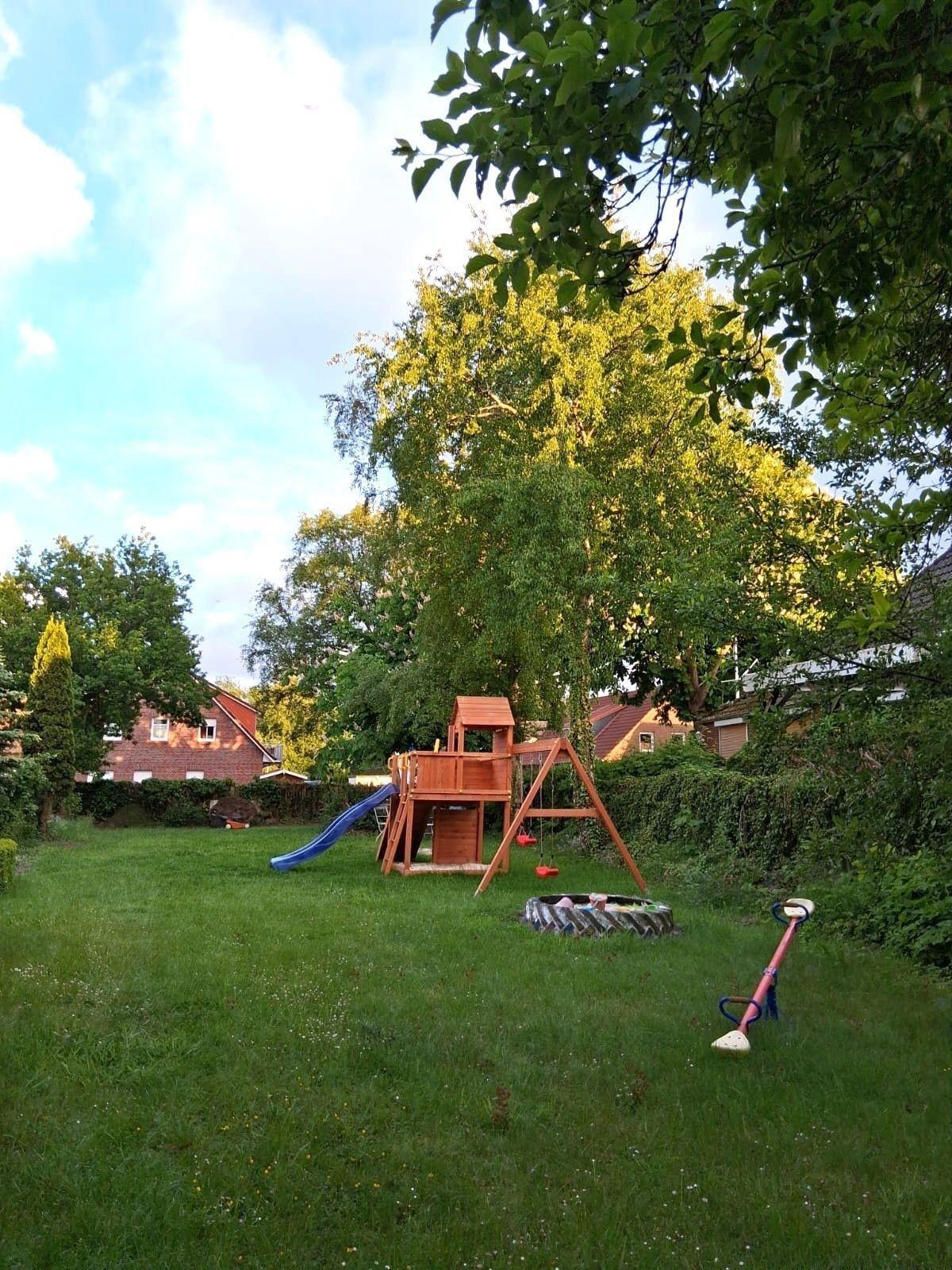 Die Ferienwohnung bietet einen einladenden Außenbereich mit einer privaten Terrasse, die zum Entspannen einlädt. Ein Spielplatz mit Schaukel und Sandkasten sorgt für Freude bei den kleinen Gästen. Die großzügige Liegewiese bietet ausreichend Platz zum Sonnenbaden und Spielen. Hier lässt sich der Aufenthalt im Freien in vollen Zügen genießen.