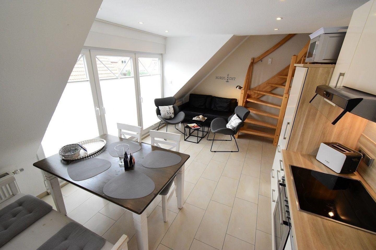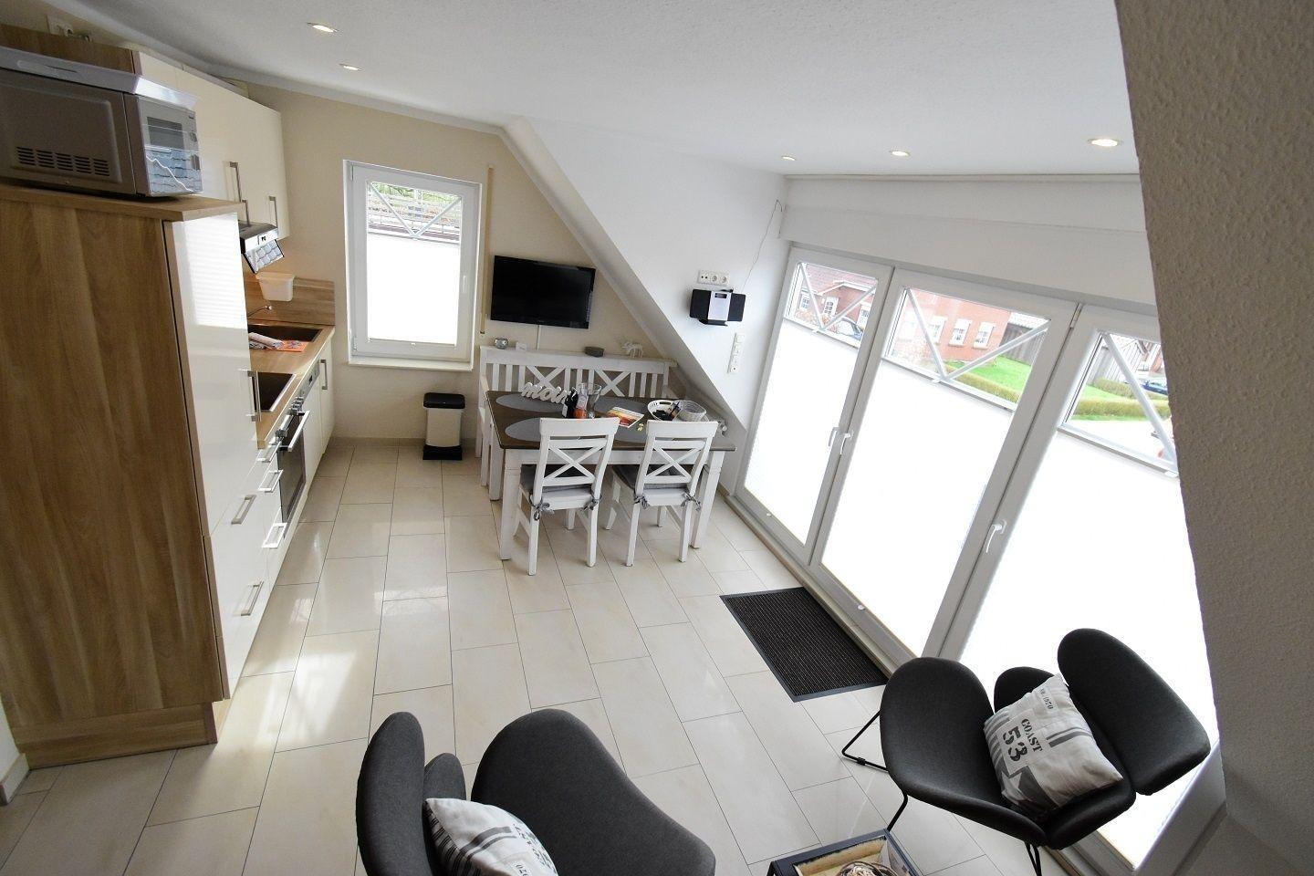 Diese moderne Obergeschosswohnung bietet Platz für 4 Personen samt Hund und liegt in ruhiger Sackgassenlage am Rande von Norddeich.