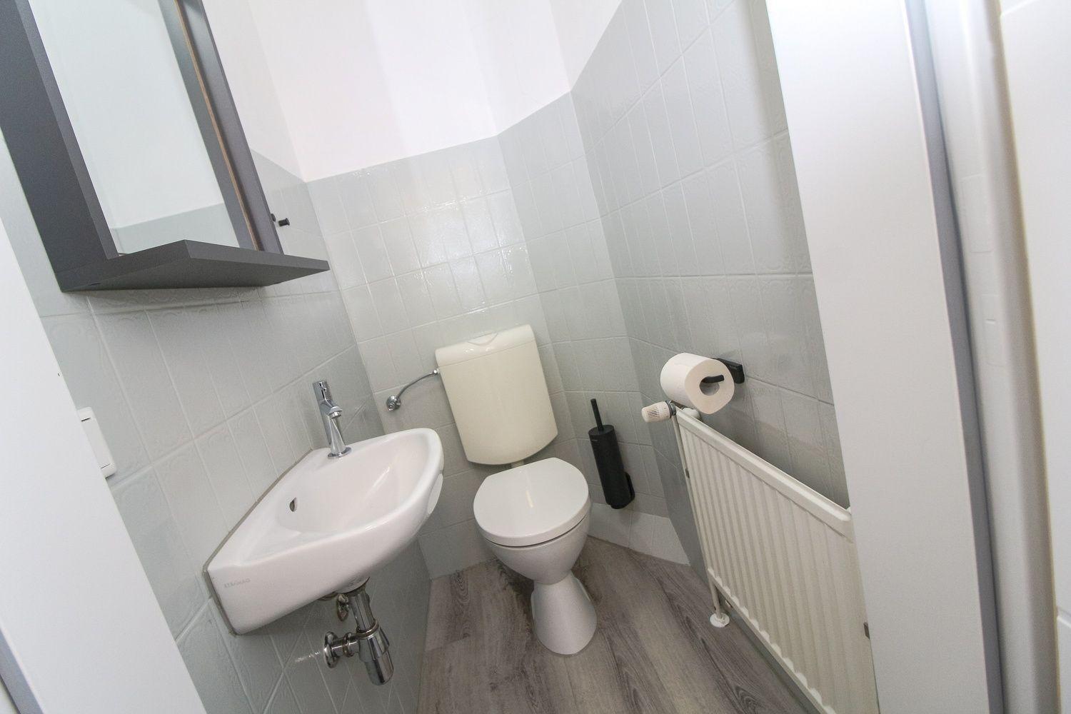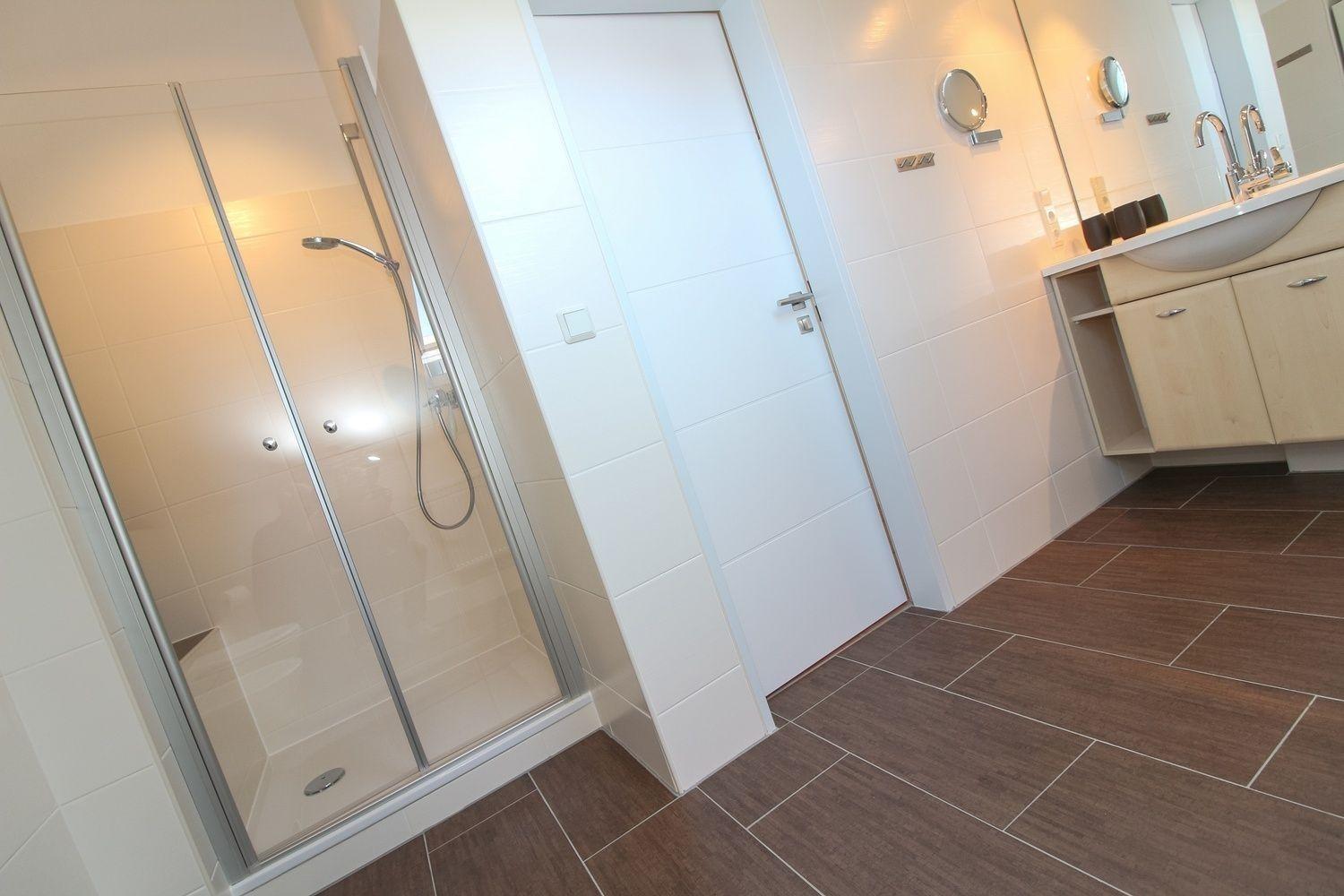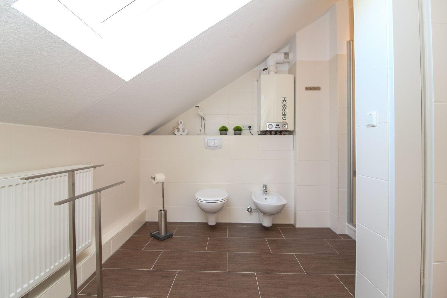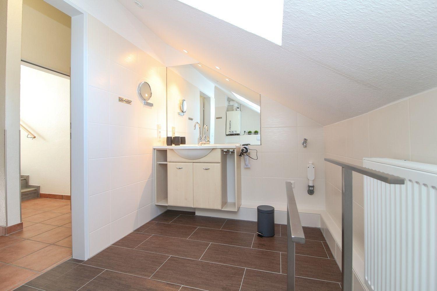 Das großzügige Bad mit WC, Waschtisch und Dusche befindet sich auf der mittleren Etage und wird dann vom großen Schlafraum im Obergeschoss abgelöst.