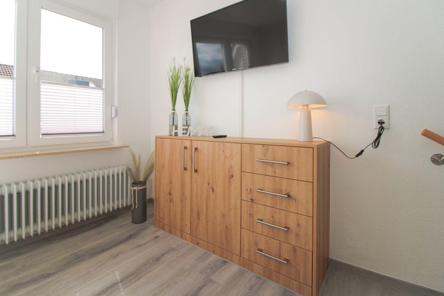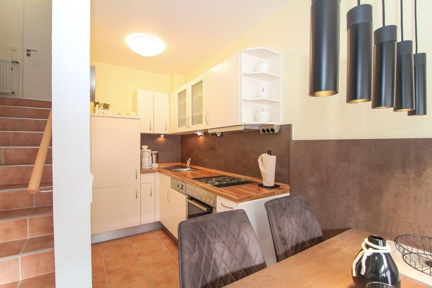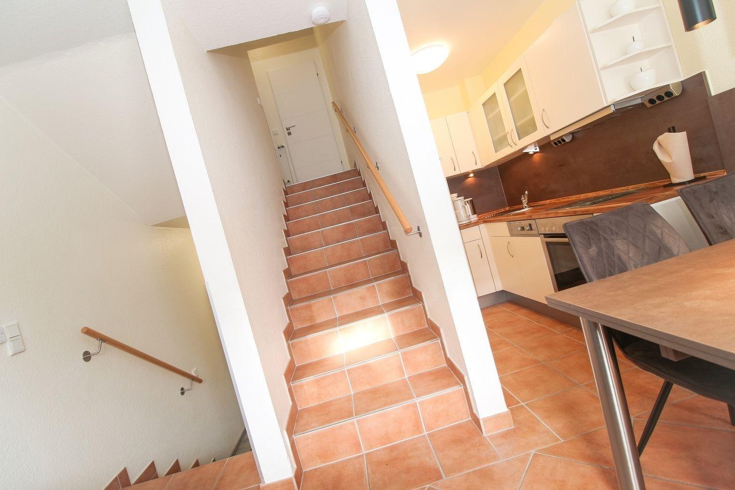 Im Erdgeschoss des Hauses befindet sich das erste Schlafzimmer mit Doppelbett und ein anliegendes Gäste-WC. Auf der nächsten Etage erwartet Sie die offene Wohnküche mit Wohnbereich und Kochniesche. Von hier aus gibt es einen direkten Zugang auf die Terrasse.