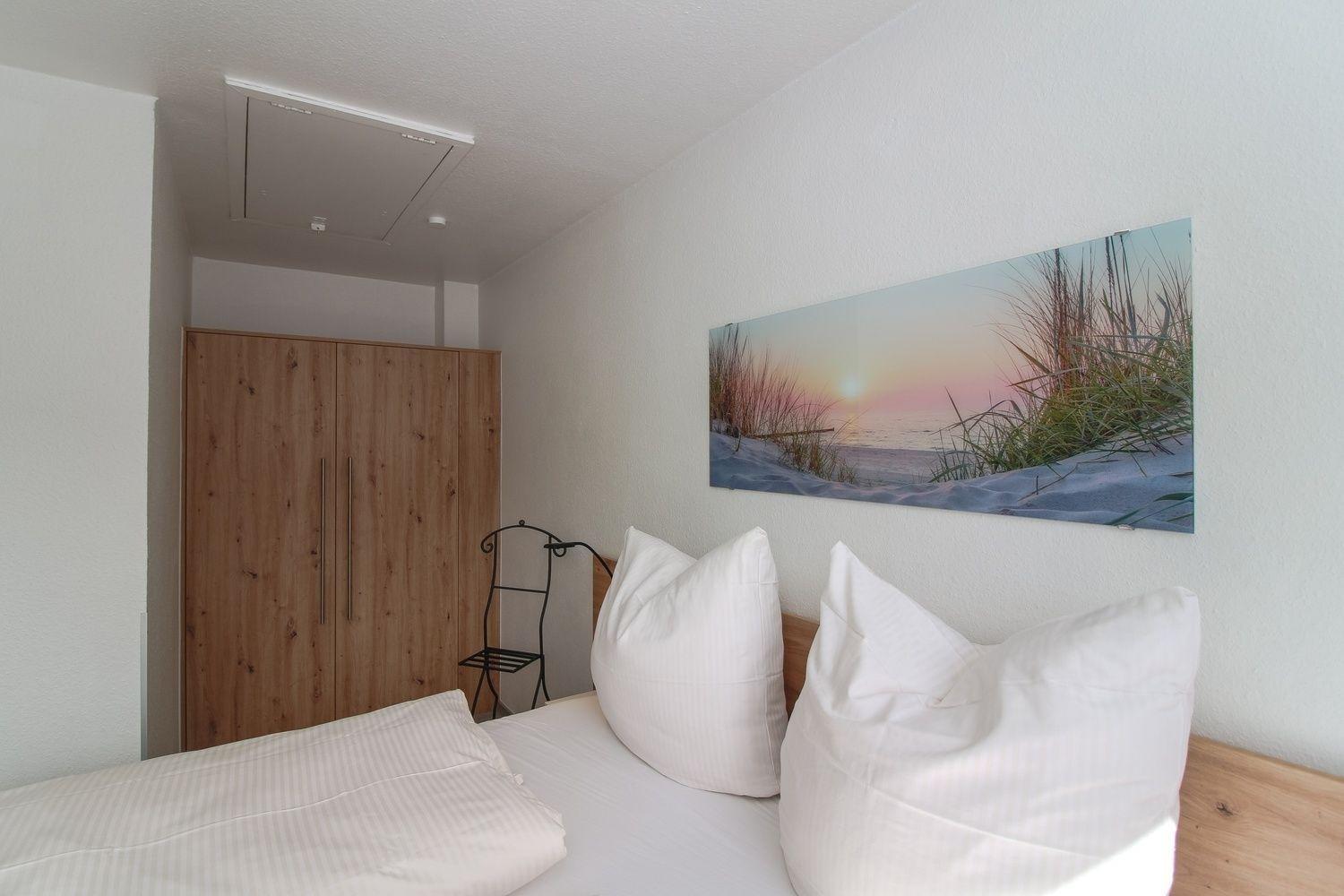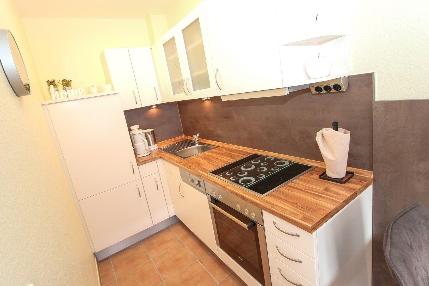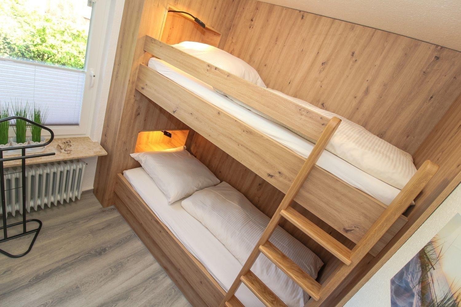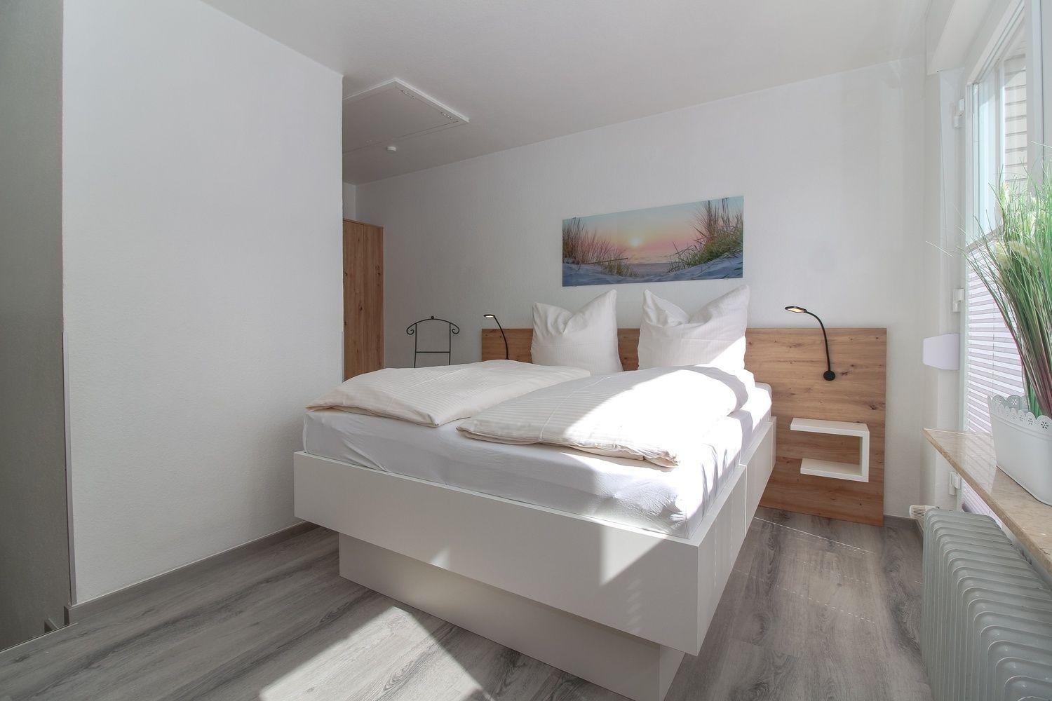 Im Erdgeschoss des Hauses befindet sich das erste Schlafzimmer mit Doppelbett und ein anliegendes Gäste-WC. Auf der nächsten Etage erwartet Sie die offene Wohnküche mit Wohnbereich und Kochniesche. Von hier aus gibt es einen direkten Zugang auf die Terrasse.