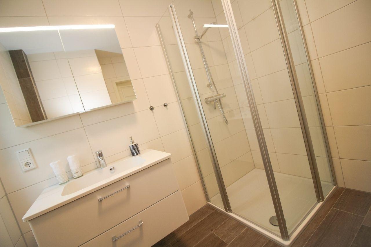 Das Bad beinhaltet einen großen Waschtisch sowie eine bodentiefe Dusche.