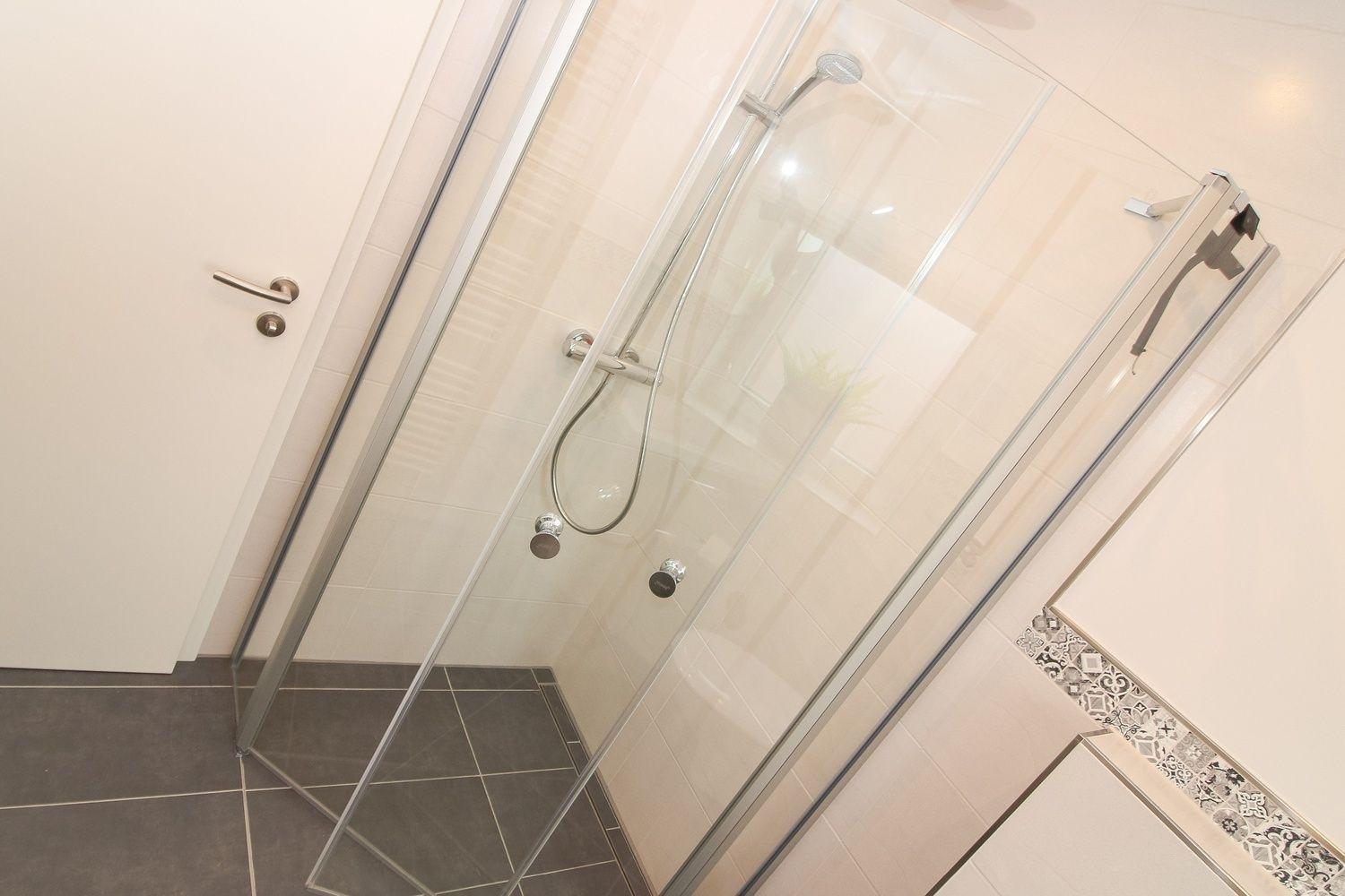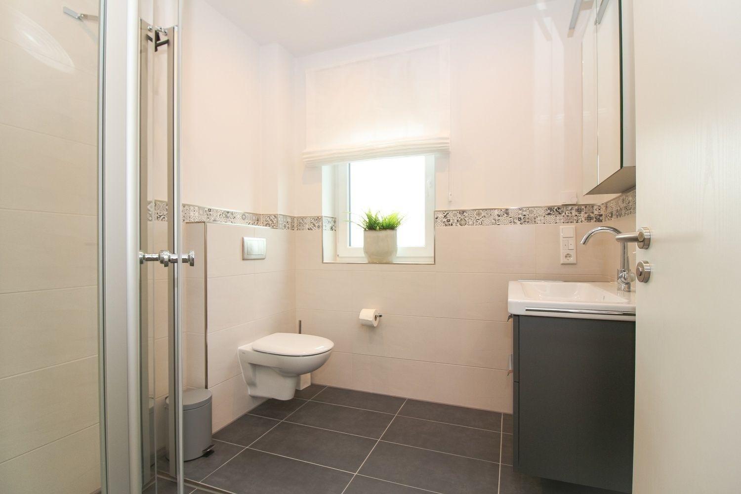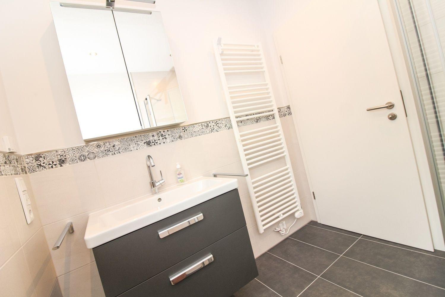Das Tageslichtbad ist mit einer bodentiefen Dusche ausgestattet.