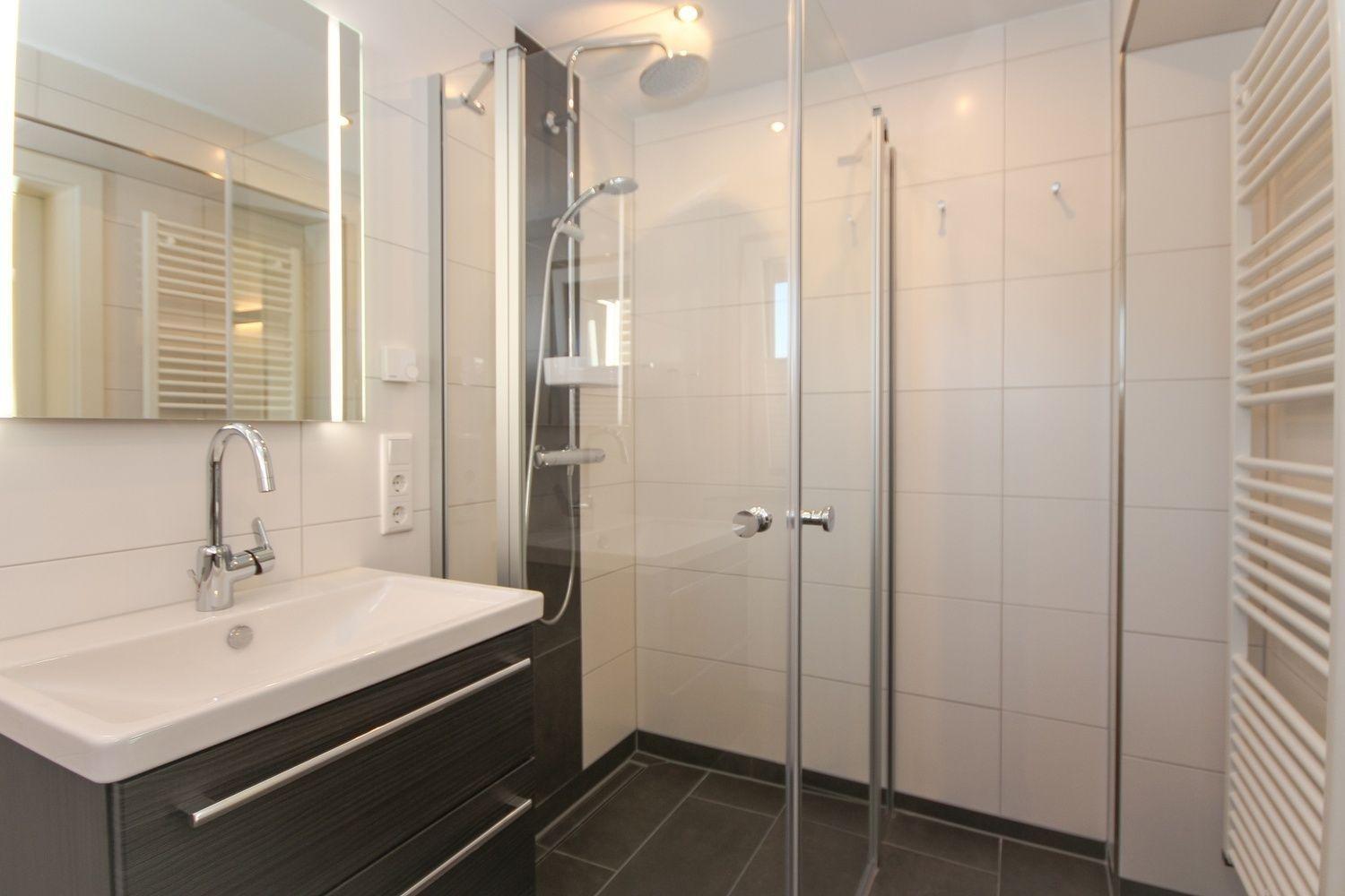 Das Bad beinhaltet eine bodentiefe Rainshower-Dusche, ein WC, einen Handtuchtrockner und einen Waschtisch.