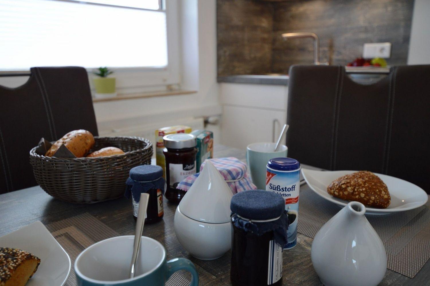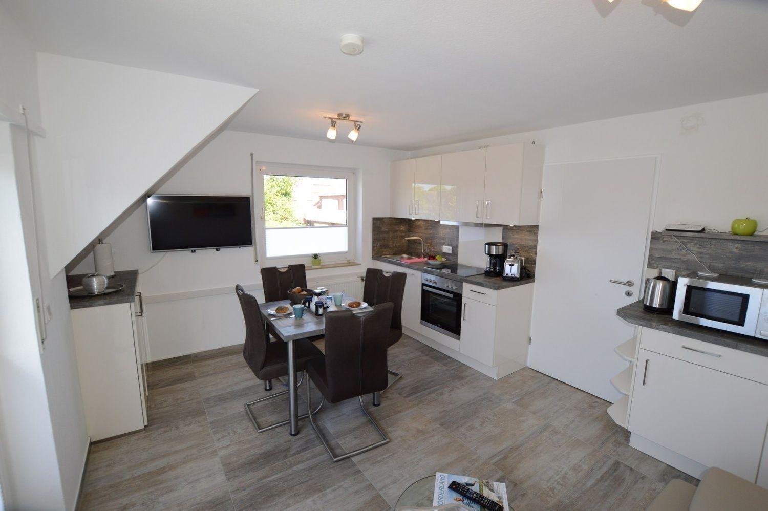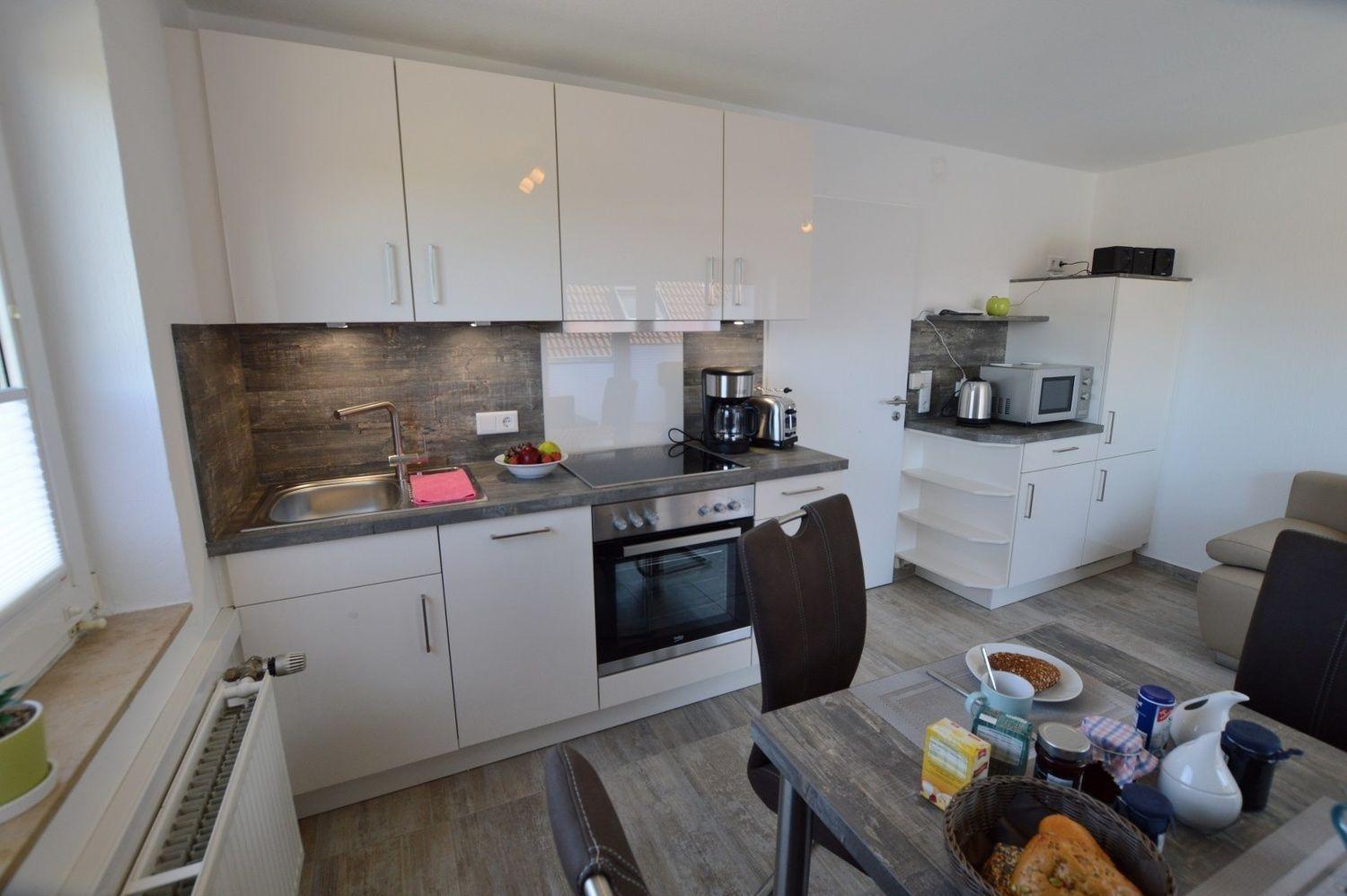Die Wohnküche mit neuer, heller Küchenzeile ist mit Ceranfeld, Backofen, Mikrowelle, Kühlschrank mit Eisfach, Spülmaschine, Kaffeemaschine, Wasserkocher sowie die Utensilien für den täglichen Gebrauch gut ausgestattet.