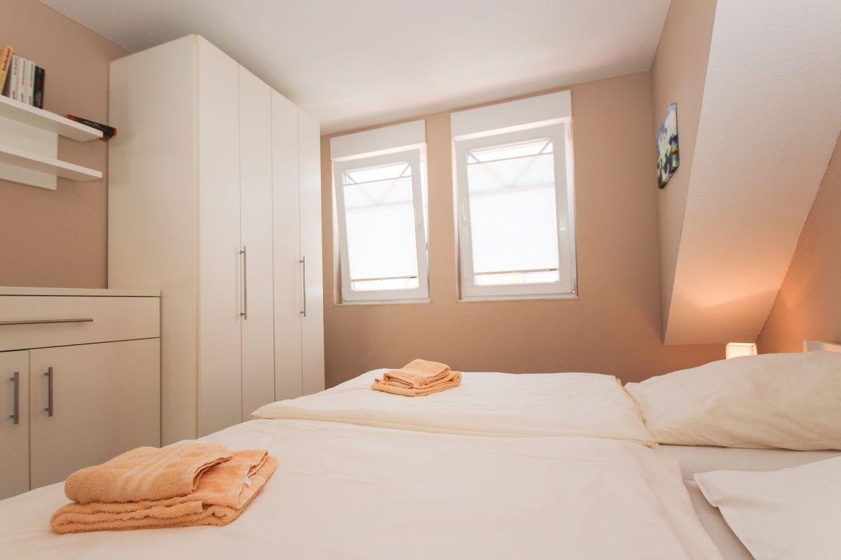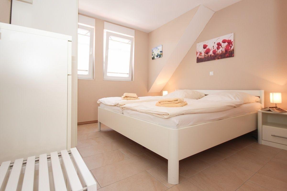 Das mit weißen Möbeln ausgestattete Schlafzimmer enthält ein Doppelbett ohne Fußteil (1,80 x 2,00 m), Kleiderschrank, Kommode sowie einen Herrendiener.