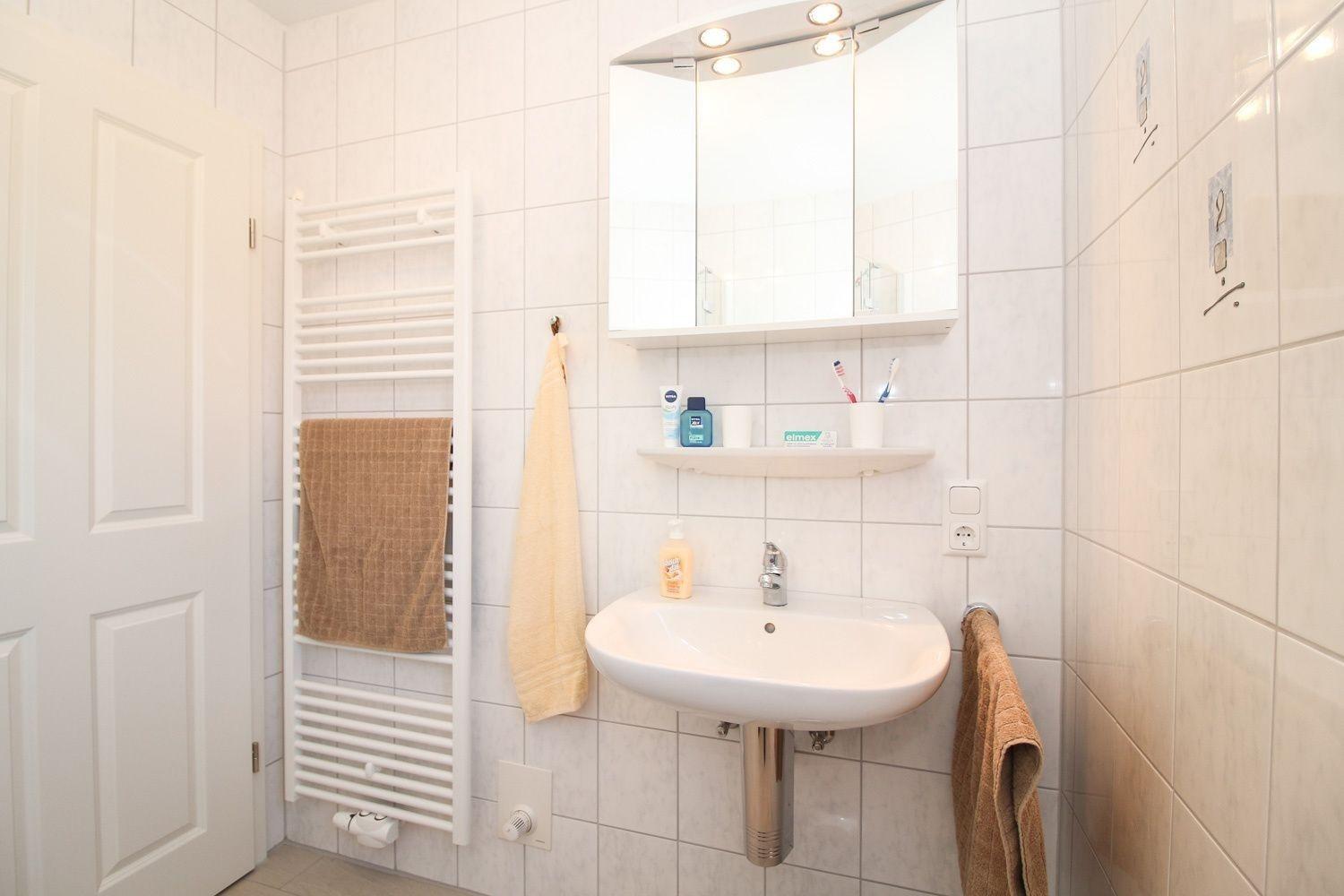 Munter werden Sie im tageshellen Bad mit Dusche/niedriger Einstieg, Waschbecken, Spiegel und WC.