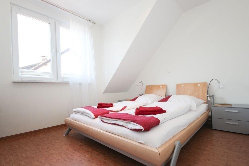Ein Doppelbett(1,60x2,00) sorgt im Elternschlafzimmer für erholsame Träume. Über die