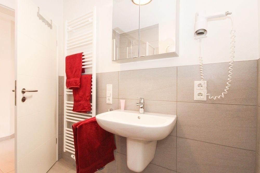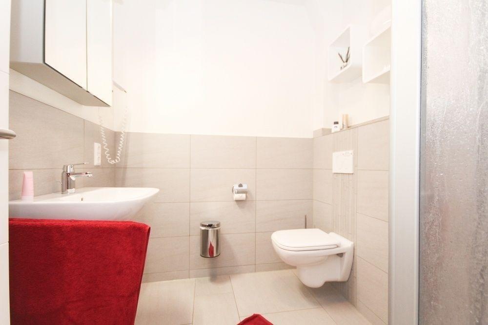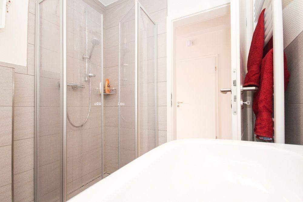 Im Badezimmer mit ebenerdiger Dusche, WC, Handtuchwärmer, Waschbecken und Fön werden Sie keine kalte Füße bekommen. Hier gibt es wie auch in allen anderen Räumen der Wohnung eine Fußbodenheizung.