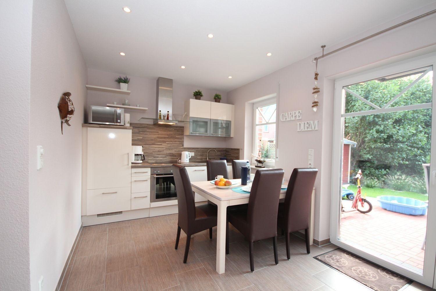 Das kombinierte Wohnzimmer mit Küche lädt zum Verweilen ein. Im Wohnbereich befindet sich eine gemütliches Sofaecke, in der Sie entspannt Filme und Serien auf dem Ambilight-Smart-TV streamen oder den Blue-Ray Player nutzen können. Eine Soundbar sorgt hierbei für guten Klang. WLAN ist in der Wohnung vorhanden. Die deckenintegrierten Halogenspots versetzen den Wohnbereich in eine behagliche Stimmung. Eine Musik-Anlage ist ebenfalls vorhanden. Die Terrassentür führt Sie in den Garten und am Abend können Sie die elektrischen Rollläden herunter lassen.