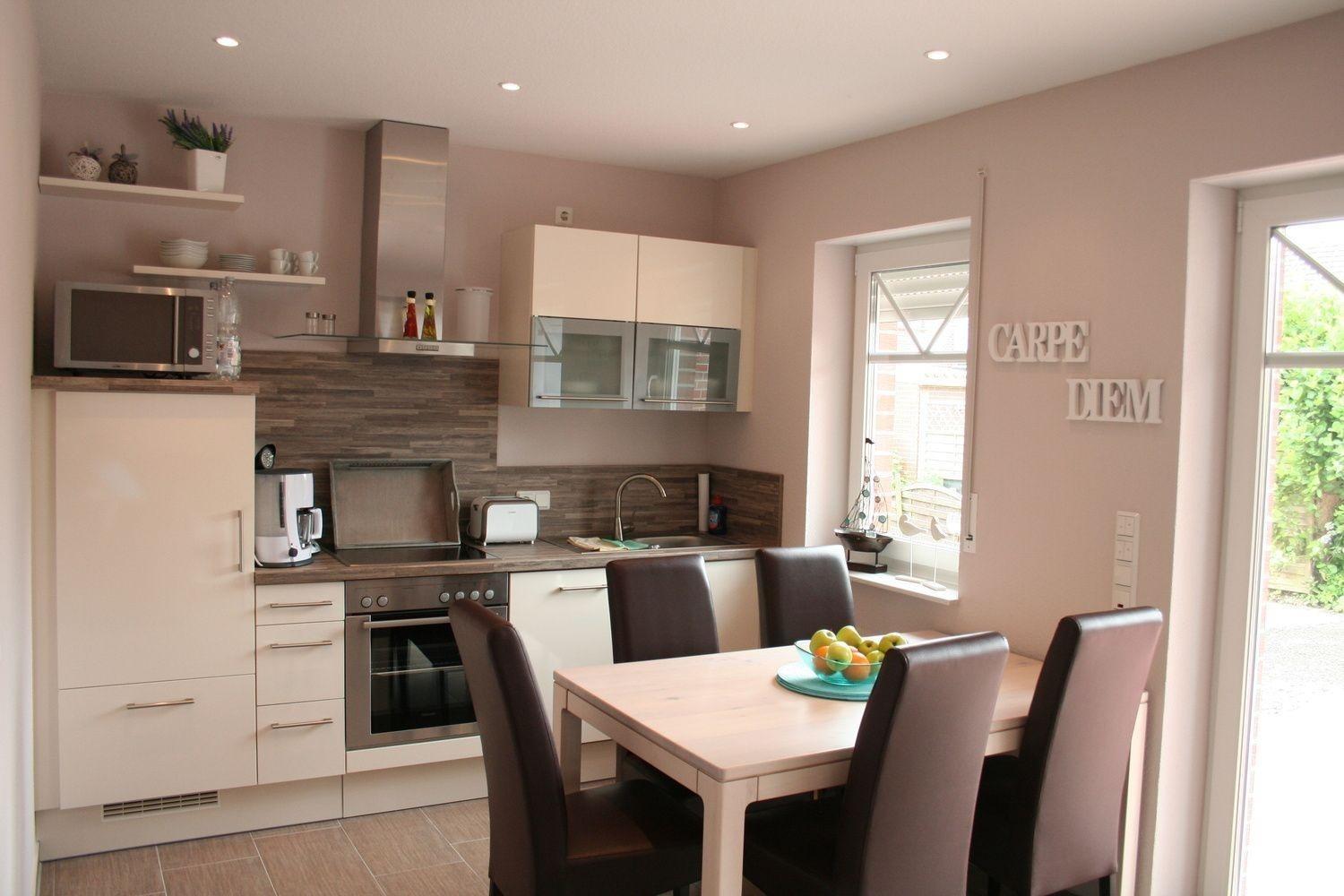 Der harmonisch abgestimmte Küchenbereich mit Essgruppe und hochwertiger Einbauküche ist ausgestattet mit Ceranfeld, Backofen, Abzugshaube, Geschirrspüler, Kühlschrank mit Eisfach, Kaffeemaschine, Mikrowelle, Wasserkocher und Toaster.