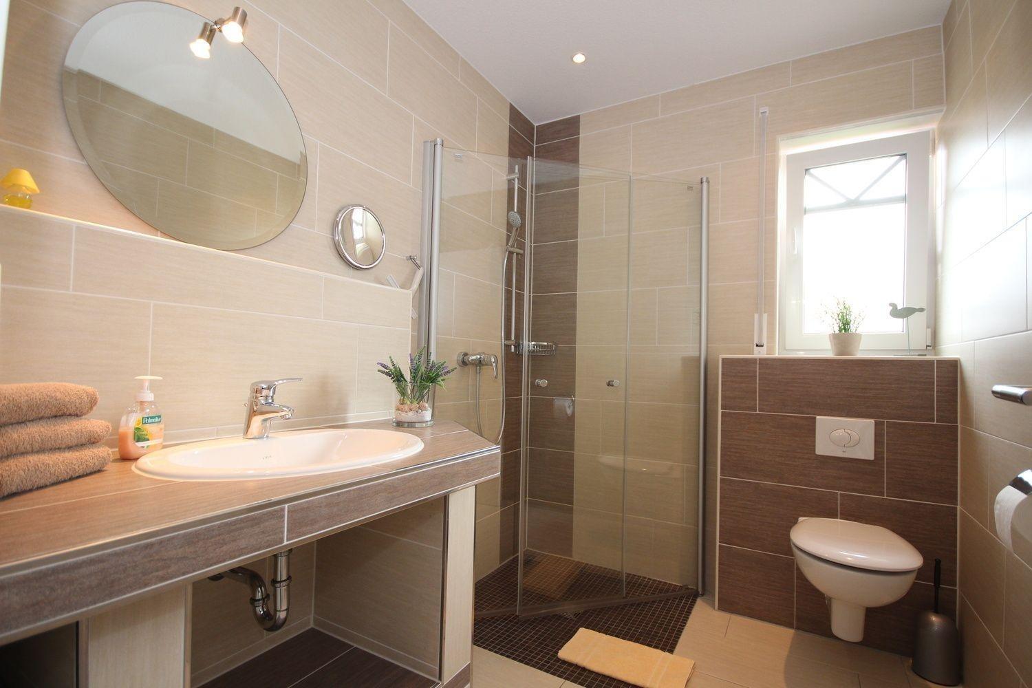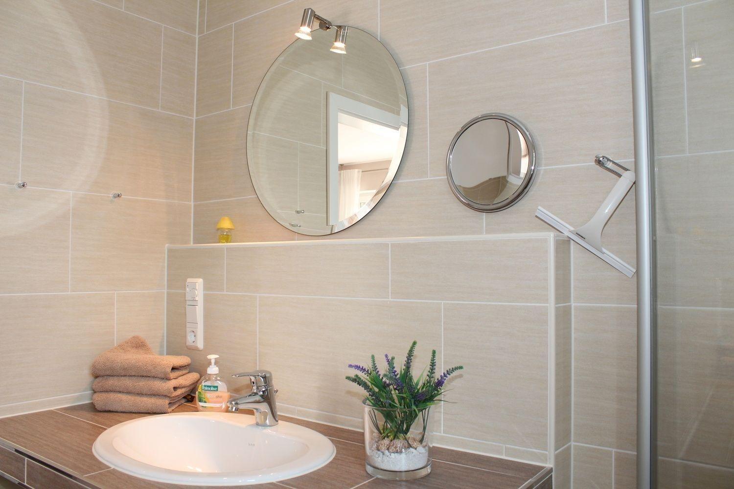 Das helle Bad mit barrierefreier Dusche vertreibt die Morgenmüdigkeit.