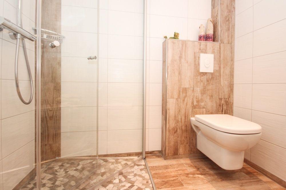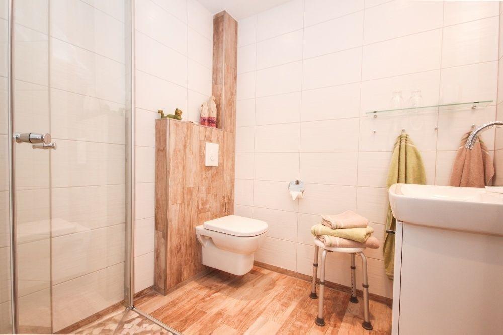 Das barrierefreie Badezimmer ist mit allen Annehmlichkeiten wie Kosmetikspiegel, Handtuchheizkörper, Waschbecken mit Unterschrank und Fön ausgestattet.