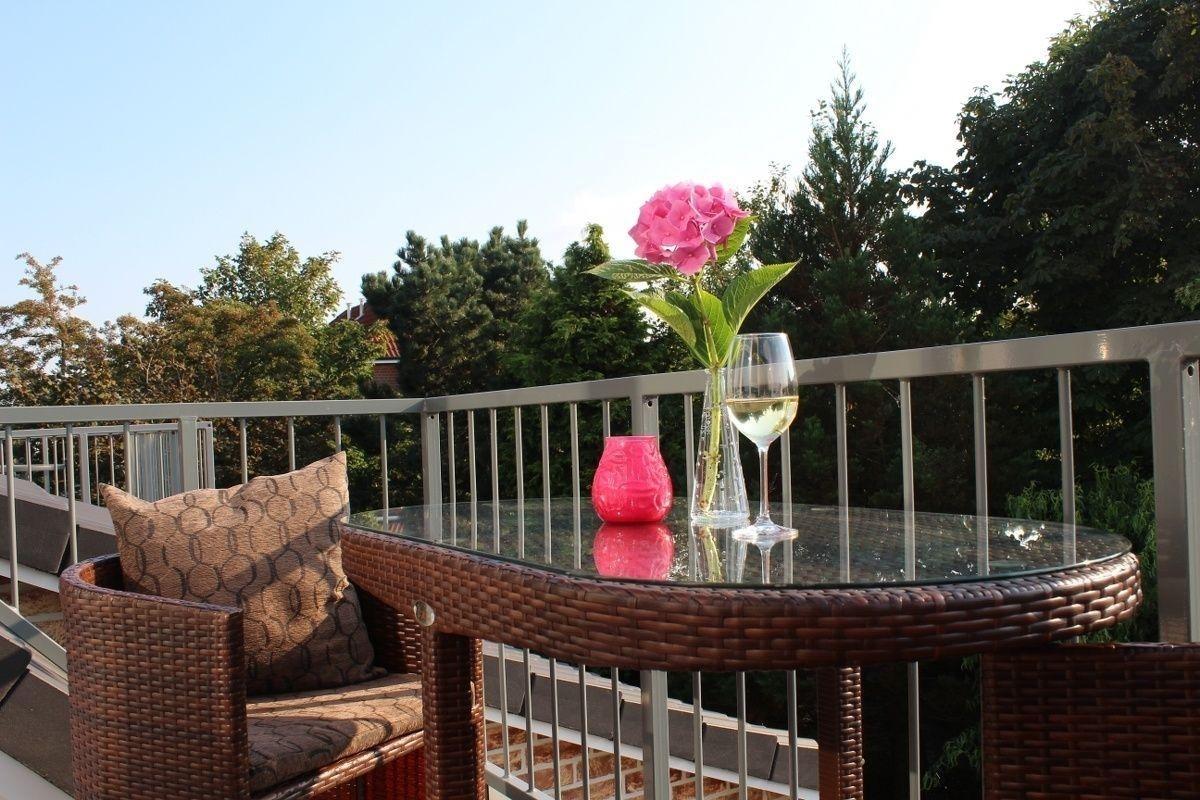 Vom Wohn-/Essbereich aus gelangen Sie auf den schönen, sonnigen Süd-West-Balkon mit stilvollem Mobiliar.