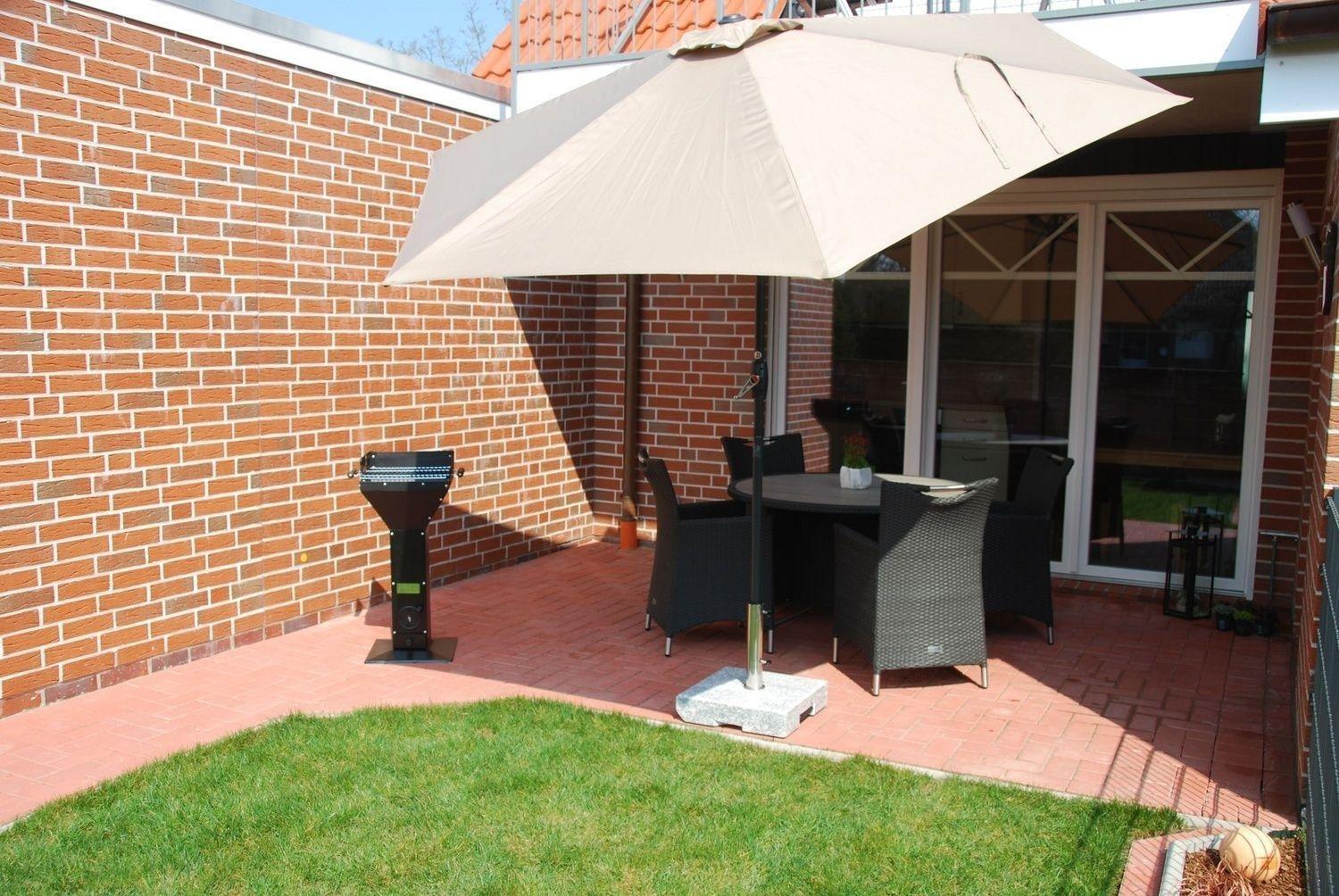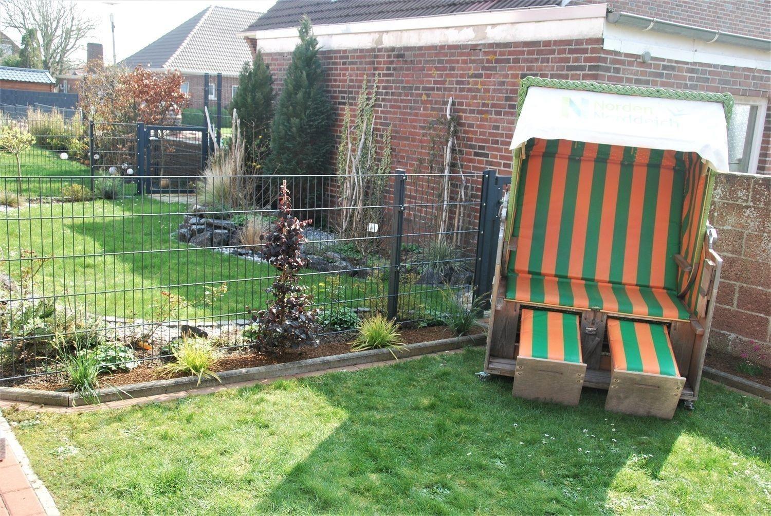 Ein Sonnenschirm, ein Strandkorb und ein Grill mit Grillbesteck stehen ebenfalls zur Verfügung.