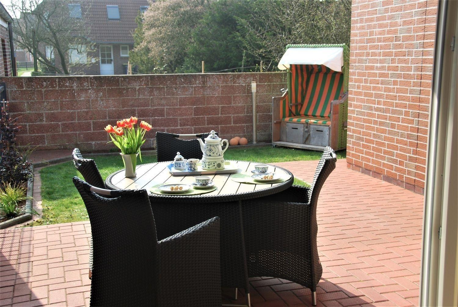 Vom Wohnzimmer aus gelangt man in den eingezäunten Garten mit großer Terrasse auf der sich eine gemütliche Sitzgruppe befindet.