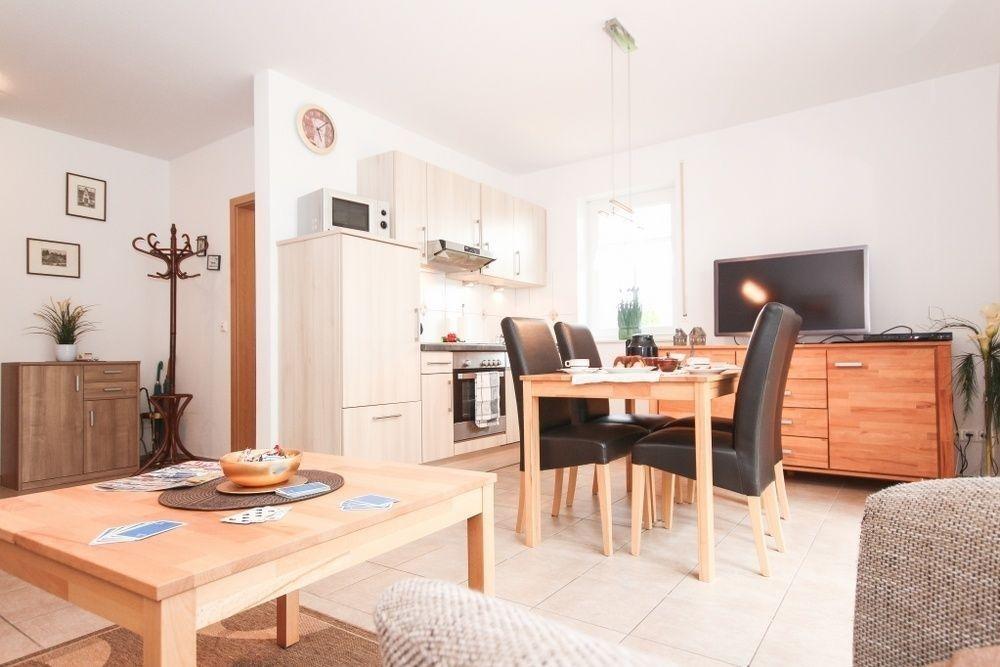 An den Küchenbereich mit vollausgestatteter Einbauküche (Mikrowelle, Geschirrspüler, Kühlschrank mit Eisfach, Toaster, Kaffeemaschine, Wasserkocher...) schließt sich mit einem Tisch und vier Stühlen der Essbereich an. Im Wohnzimmer können Sie es sich auf der hochwertigen Schlafcouch( Liegefläche 2,12 x1,50 m) oder auf den Sesseln gemütlich machen und auf dem großen Flachbildschirm-TV einen schönen Spielfilm ansehen.