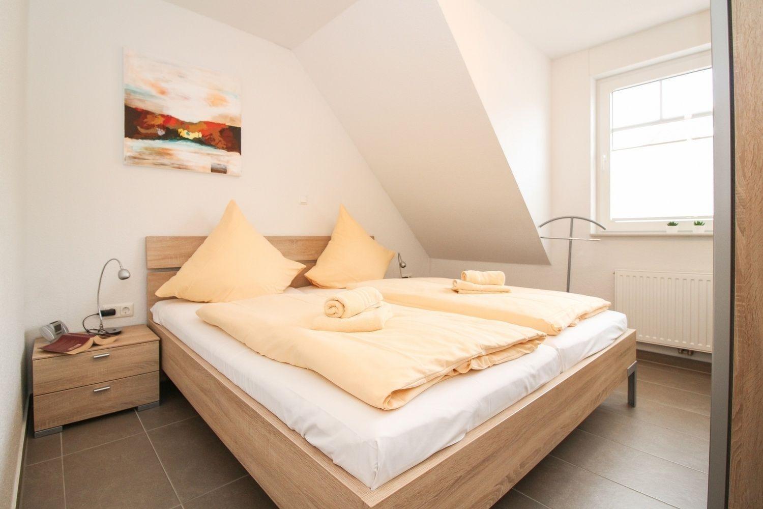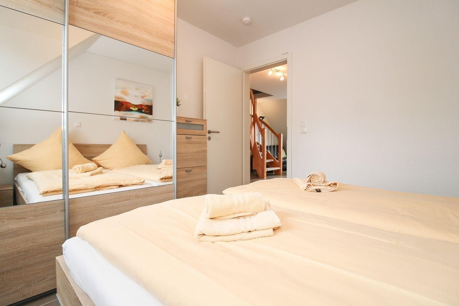 Ein Doppelbett (1,802,00m) mit verstellbarem Lattenrost und Kaltschaummatratzen, daneben stehen 2 geräumige Nachtkonsolen mit Funkweckern (mit Wandprojektion) und LED-Lampen für Sie bereit. Kleiderschrank, Kommode und ein Herrendiener gehören ebenfalls zur Ausstattung des Elternschlafzimmers.