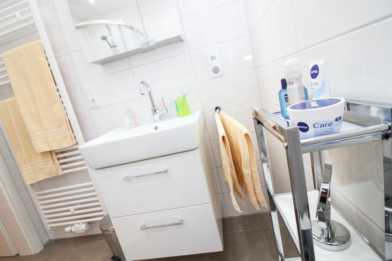 Das moderne Bad mit Dusche, WC, Waschbecken, Handtuchwärmer, Fön, Radio, Duschhocker, Kinderhocker und Fußbodenerwärmung wurde ebenfalls in warmen Naturtönen gehalten.