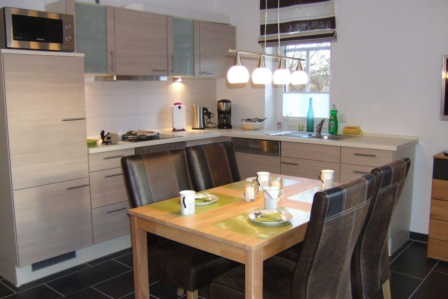 Die helle Wohnküche ist ausgestattet mit einer Mikrowelle, Ceranfeld, Backofen, Kühlschrank mit Gefrierfach, Kaffeemaschine, Toaster, Wasserkocher, Essbesteck, tiefen und flachen Teller und einer Spülmaschine.