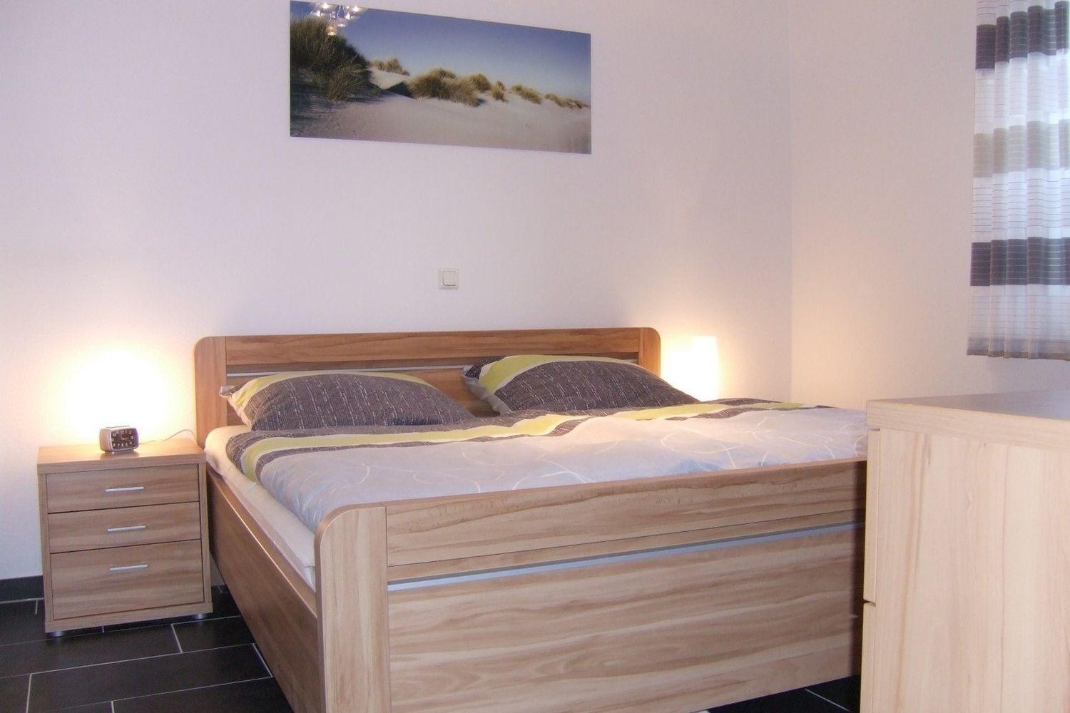 Im Schlafzimmer befindet sich ein Doppelbett, ein Kleiderschrank mit Kommode und ein Flachbildschirm- TV.