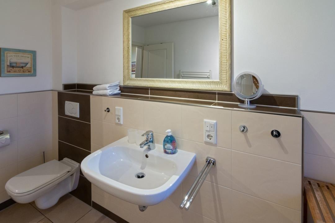 Das Badezimmer bietet eine Dusche, ein WC, einen Haartrockner, ein Waschbecken, einen Kosmetikspiegel und einen Spiegel. Es gibt ein Fenster und warmes Wasser. Im Außenbereich gibt es Gartenmöbel auf dem Balkon, Sonnenliegen und einen Windschutz. Diese umfangreiche Ausstattung sorgt für einen komfortablen und entspannten Aufenthalt in Norddeich.