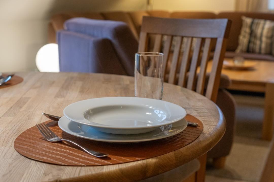 Für Unterhaltung sorgen Internet und WLAN, ein TV, ein Radio, ein DVD-Spieler sowie Bücher und Spiele. Die Küche ist offen zum Wohnzimmer und ausgestattet mit einem Ceranherd, einem Gefrierfach oder -schrank, einer Espressomaschine, einer Mikrowelle, einem Kühlschrank und einer Spülmaschine. Weitere Küchengeräte umfassen eine Kaffeemaschine, einen Wasserkocher, einen Mixer, einen Toaster, einen Eierkocher und einen Elektrogrill. Geschirr und Besteck, Geschirrhandtücher und Gewürze sind ebenfalls vorhanden, ebenso wie ein Abfalleimer.