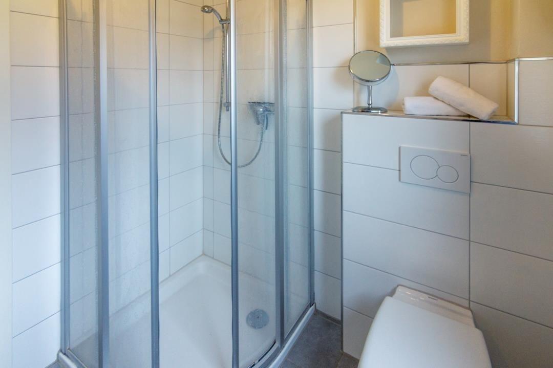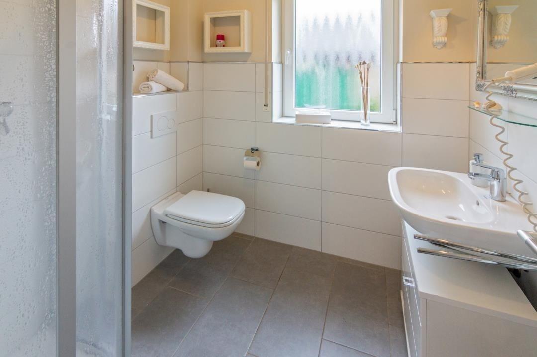 Das Badezimmer verfügt über Tageslicht und ist eine kleine Wohlfühloase, mit einer Dusche, einem WC, Spiegel und einer heizbaren Handtuchhalterung.