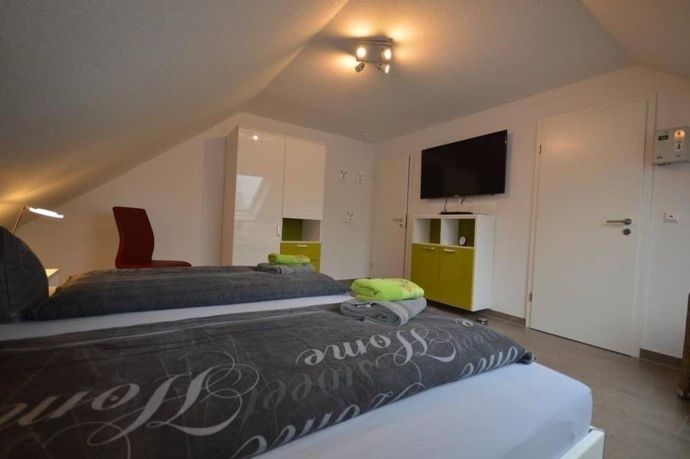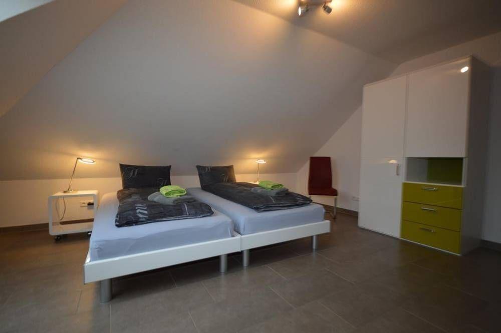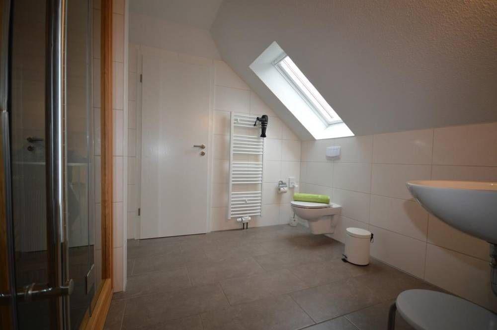 Im Obergeschoss finden Sie zwei Einzelbetten (155 x 220 cm Oberbetten), eine Schlafcouch und auf Wunsch ein Kinderreisebett vor. Auch hier befindet sich ein Flachbildfernseher. Zudem ein Blu-Ray-Player, eine Kommode und ein Kleiderschrank. Im angrenzenden Badezimmer ist die Stavenger-Sauna, ein WC, Waschbecken und Duschbereich (120 x 90 cm) untergebracht.