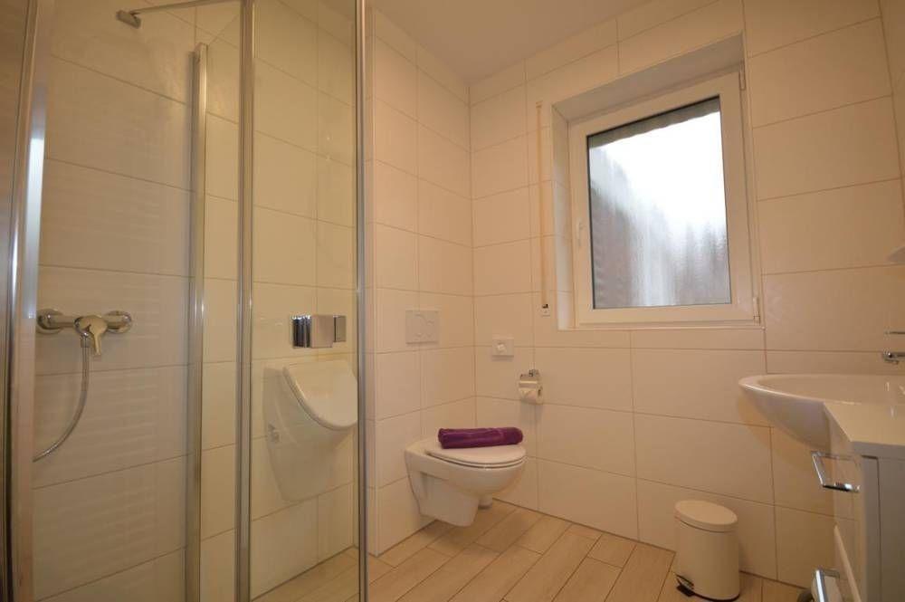 Tageslichtbad mit WC, ein Urinal, eine ebenerdige Dusche mit Echtglastüren sowie ein Handtuchheizkörper und Föhn.