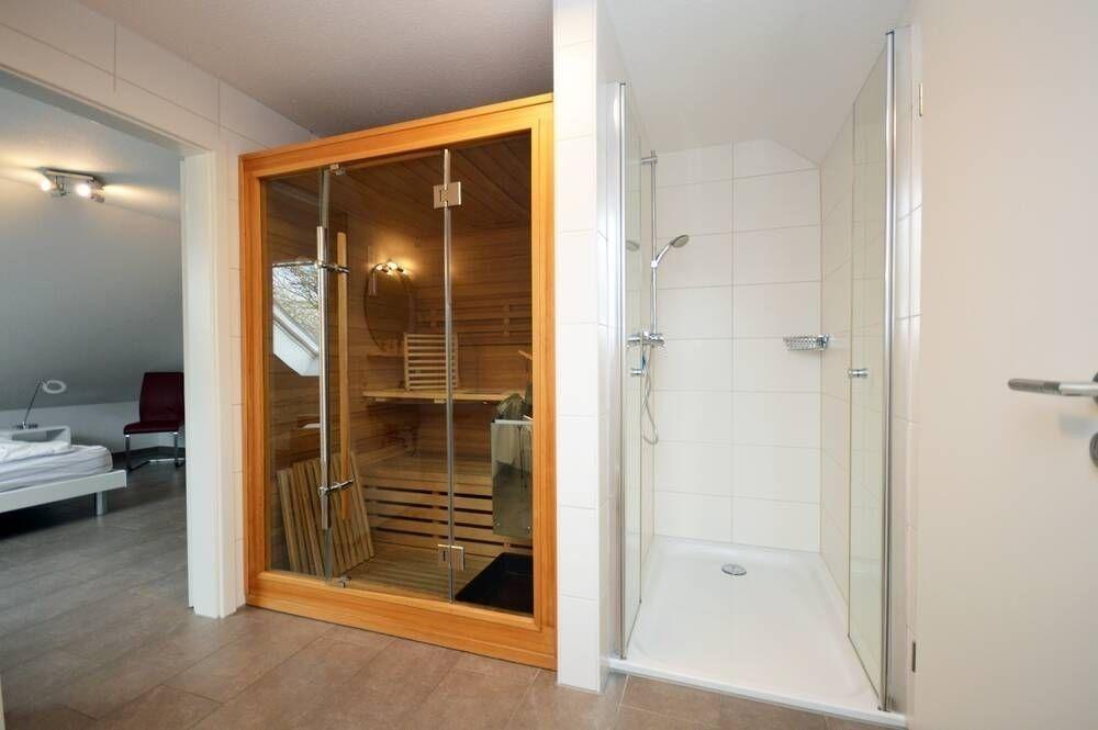 Stavenger-Sauna, ein WC, Waschbecken und Duschbereich (120 x 90 cm)