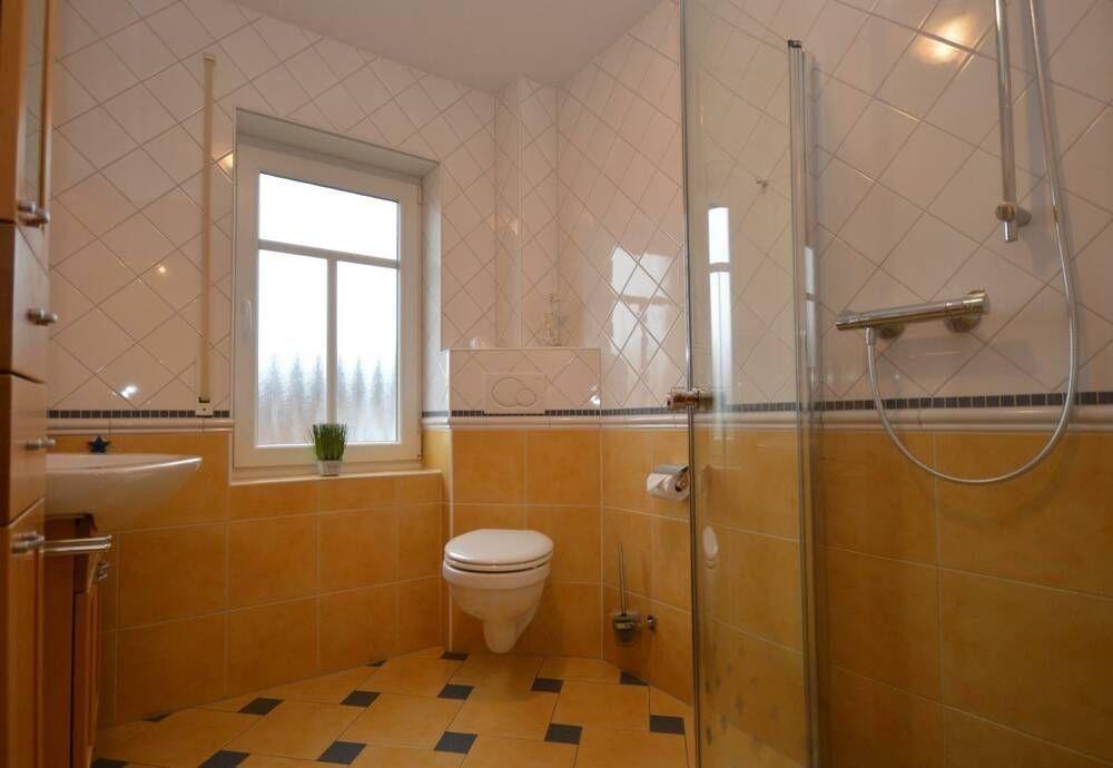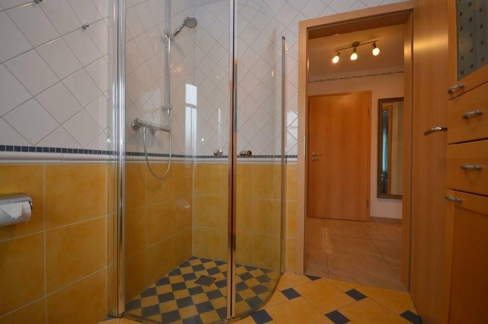 Das Tageslicht-Bad, verfügt über eine bodentiefe Dusche, ein Waschbecken mit Unter- und Hängeschrank sowie einem beheizbaren Handtuchtrockner.