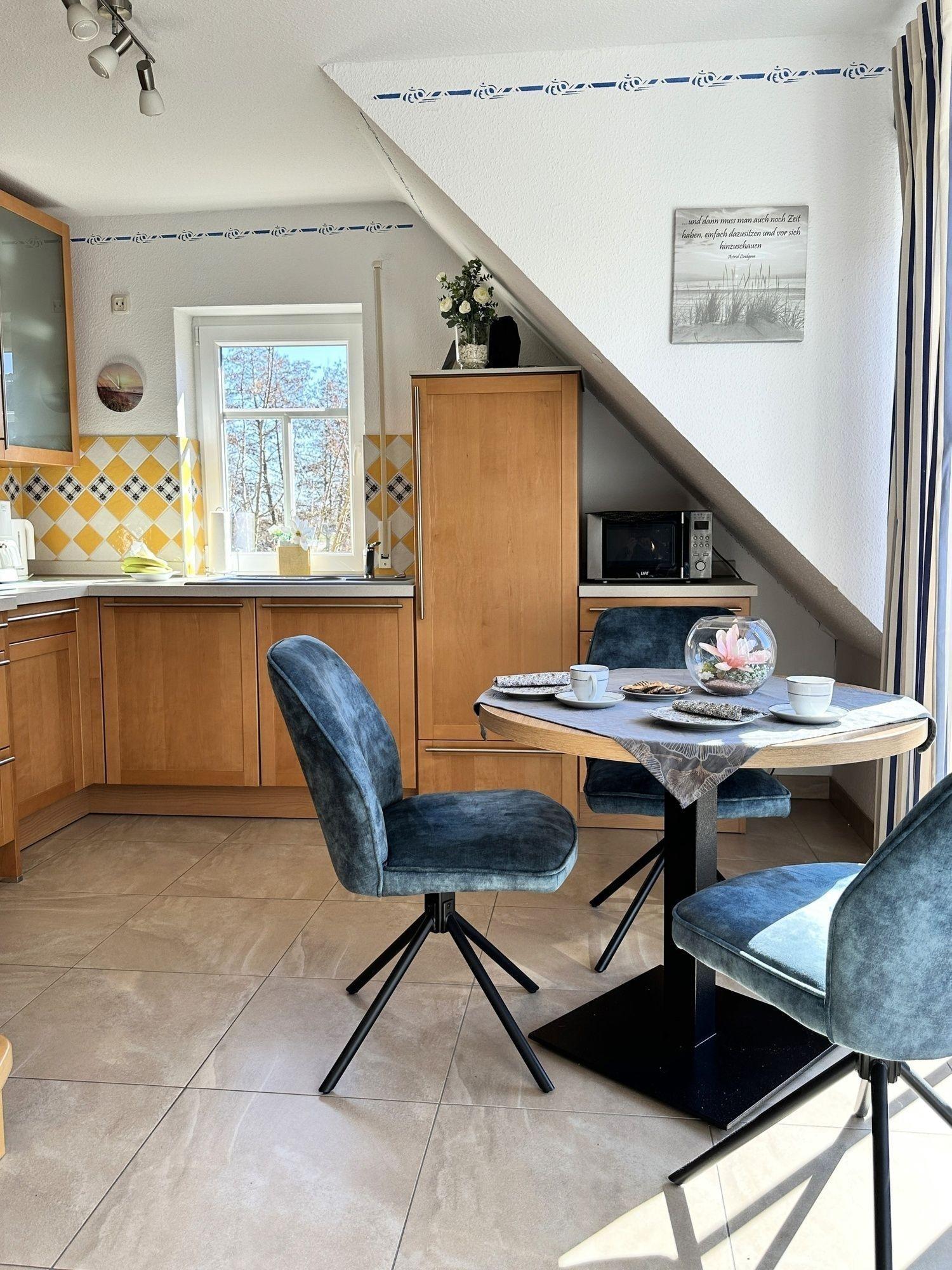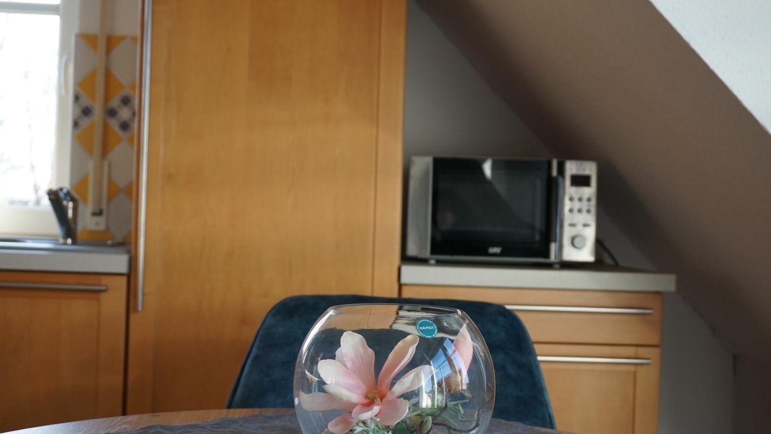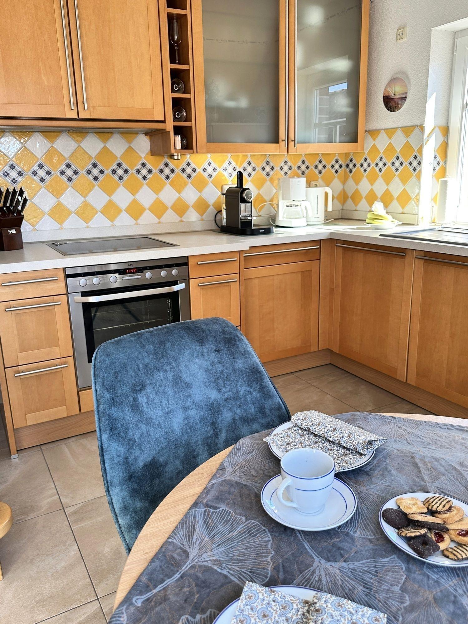 In der gut ausgestattete Küche, lassen sich Mahlzeiten zubereiten, die dann am Esstisch zu sich genommen werden können, oder auf dem möblierten Balkon in Süd-Westrichtung.