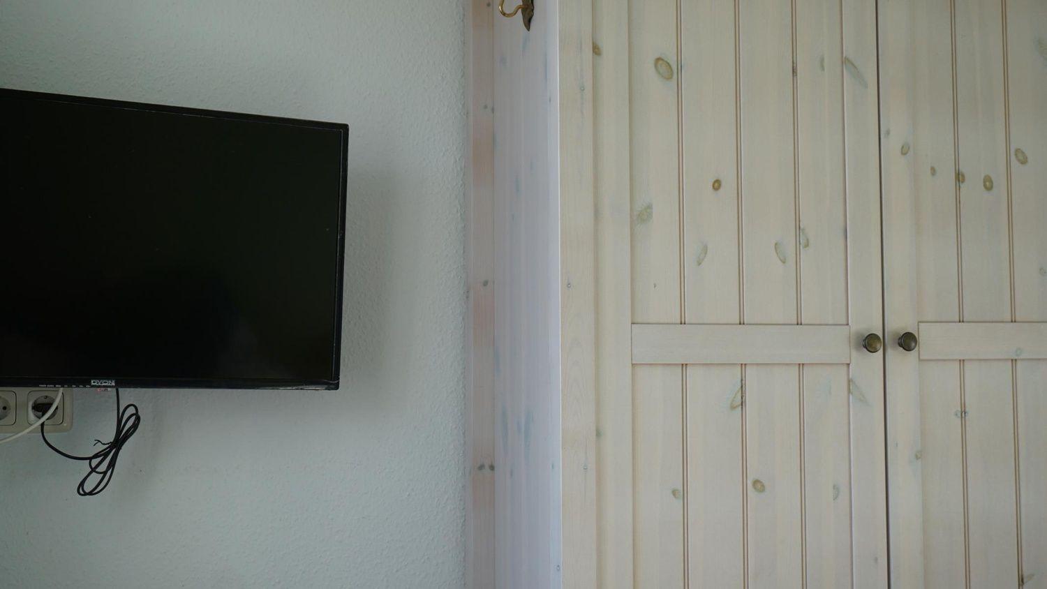 Das Schlafzimmer verfügt über einen Fernseher, einen Kleiderschrank für mitgebrachte Kleidung und ein großes Doppelbett.