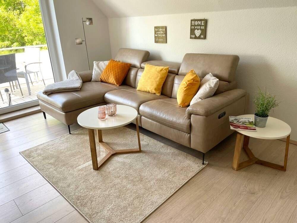 Im Wohnzimmer steht Ihnen eine hochwertige Ledercouch sowie ein großer Flachbildschirm-TV zur Verfügung. An ihn schließt sich der Küchenbereich mit einer hochwertigen Einbauküche mit Kühlschrank inklusive Gefrierfach, Ceranfeld, Wasserkocher, Kaffeemaschine, Toaster, Mikrowelle und einem Esstisch an.