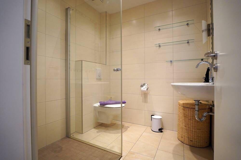 Das moderne Badezimmer ist mit einer begehbaren Dusche, WC, Spiegel und beheizbarem Handtuchhalter ausgestattet und selbst kaltes Wetter kann Ihnen nichts anhaben, da die ganze Wohnung über eine Fußbodenheizung verfügt.