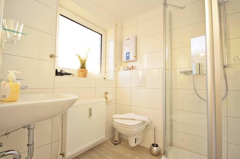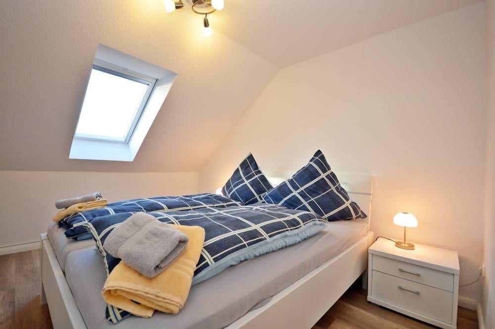 Im Obergeschoss haben Sie Diele, das Schlafzimmer mit Doppelbett, Schrank und TV sowie das Badezimmer mit einer sehr flachen Duschwanne und Echtglastüren.