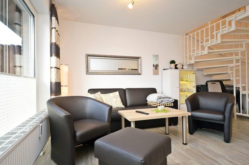 Hereinspaziert in diese hochwertig ausgestattete Ferienwohnung. Im hellen Wohn-/Esszimmer, mit direktem Zugang zur Terrasse, finden Sie eine gemütliche Ledergarnitur und Sessel für nette Fernsehabende. Bei einer Belegung mit drei/vier Personen wird diese zur Schlafgelegenheit.