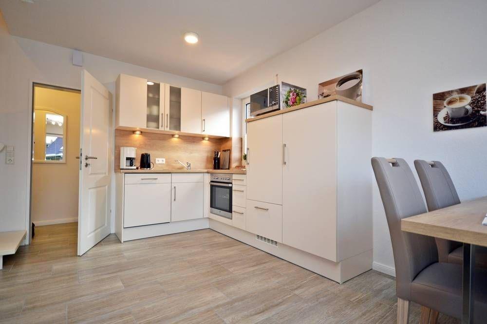 Eine gemütliche Essecke grenzt an der voll ausgestatteten Einbauküche.