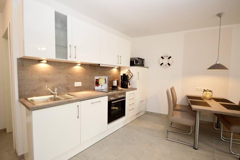 Die helle Hochglanzküche ist mit Geschirrspüler, 4-Platten-Cerankochfeld, Backofen, Kühlschrank/Gefrierfach und Mikrowelle, Kaffeemaschine, Wasserkocher und Toaster ausgestattet.