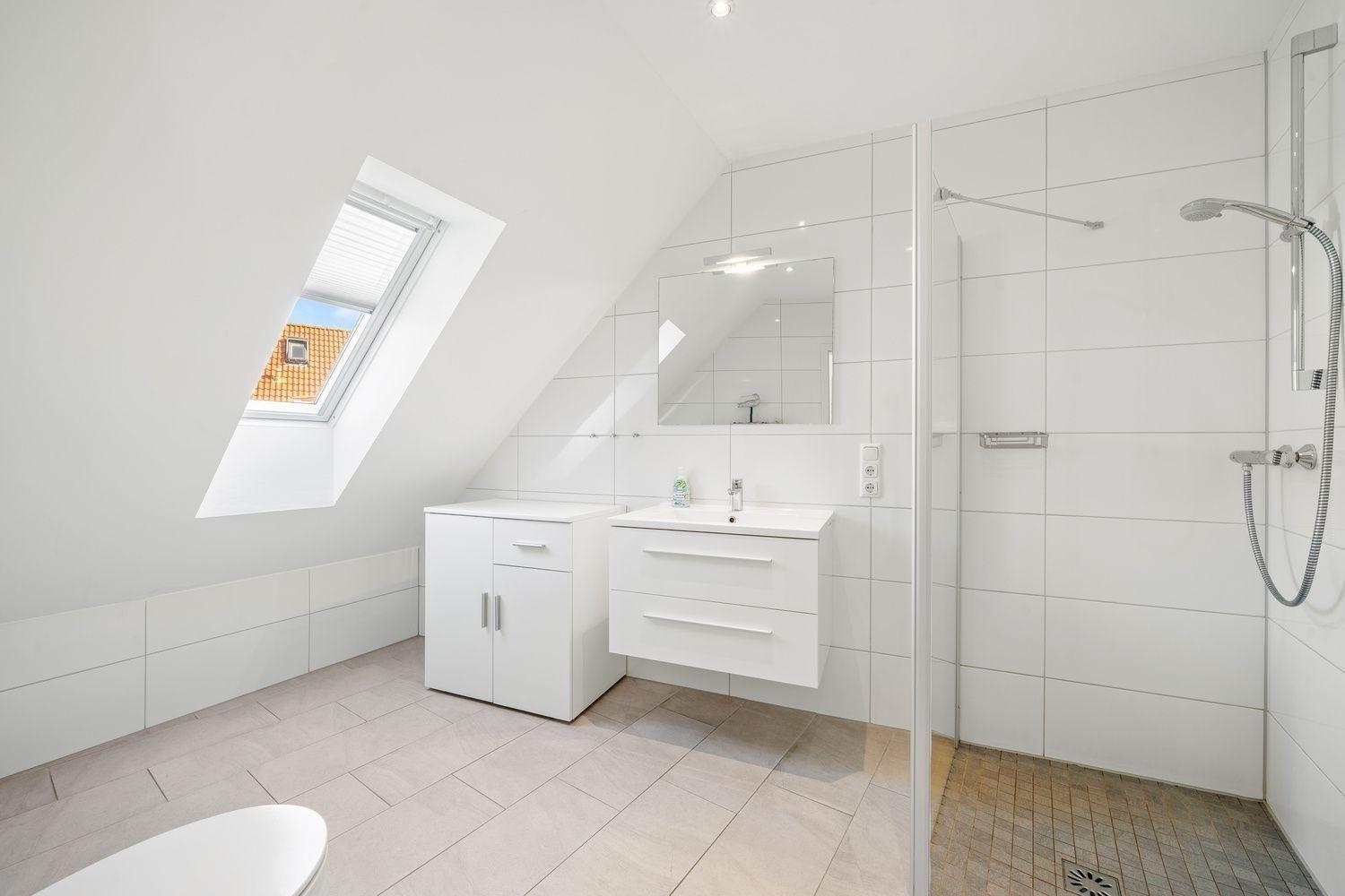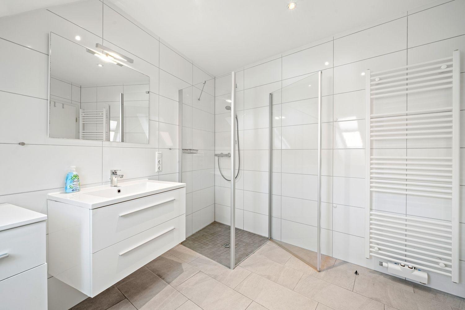 Das Bad ist sehr modern und hochwertig gehalten. Für Ihr Wohlbefinden ist es mit einer Fußbodenheizung und einer ebenerdigen Glasdusche ausgestattet und verfügt über einen Handtuchtrockner. Ein Fön ist im Bad vorhanden.