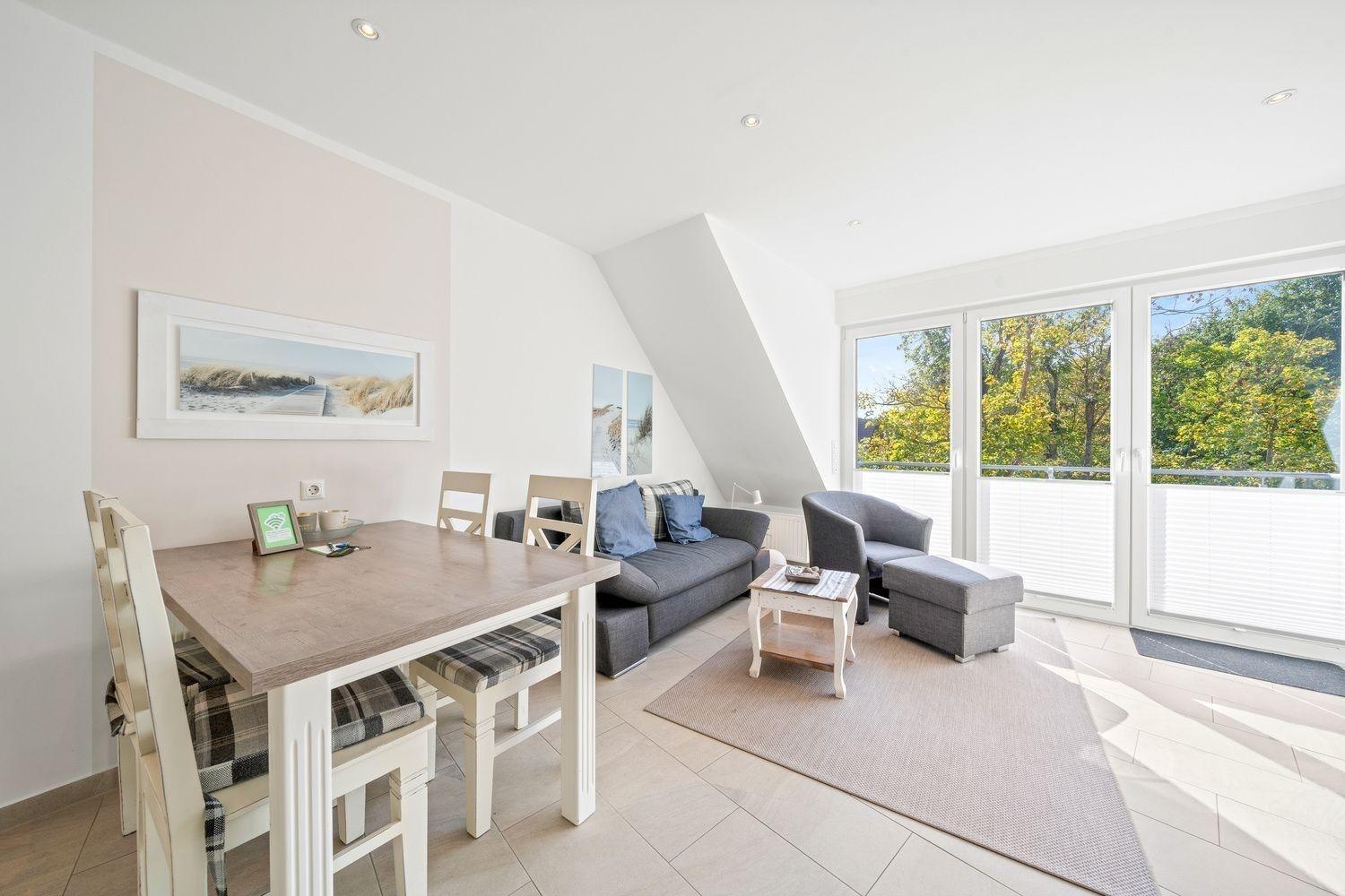 Der Wohn-Essbereich ist im friesischen Stil eingerichtet und bietet eine weiße Hochglanzküche mit vollständiger Ausstattung, einen großen Esstisch sowie eine gemütliche Sitzgarnitur, von der aus Sie bis auf den Deich blicken können. Im Wohnbereich ist ein großer Smart-TV vorhanden, sodass einem entspannten Fernsehabend nichts im Wege steht. Das Sofa dient bei einer Belegung mit vier Personen als Schlafmöglichkeit.