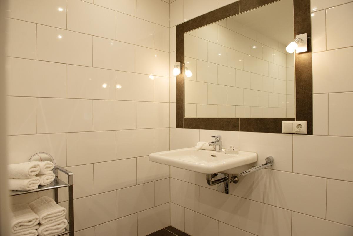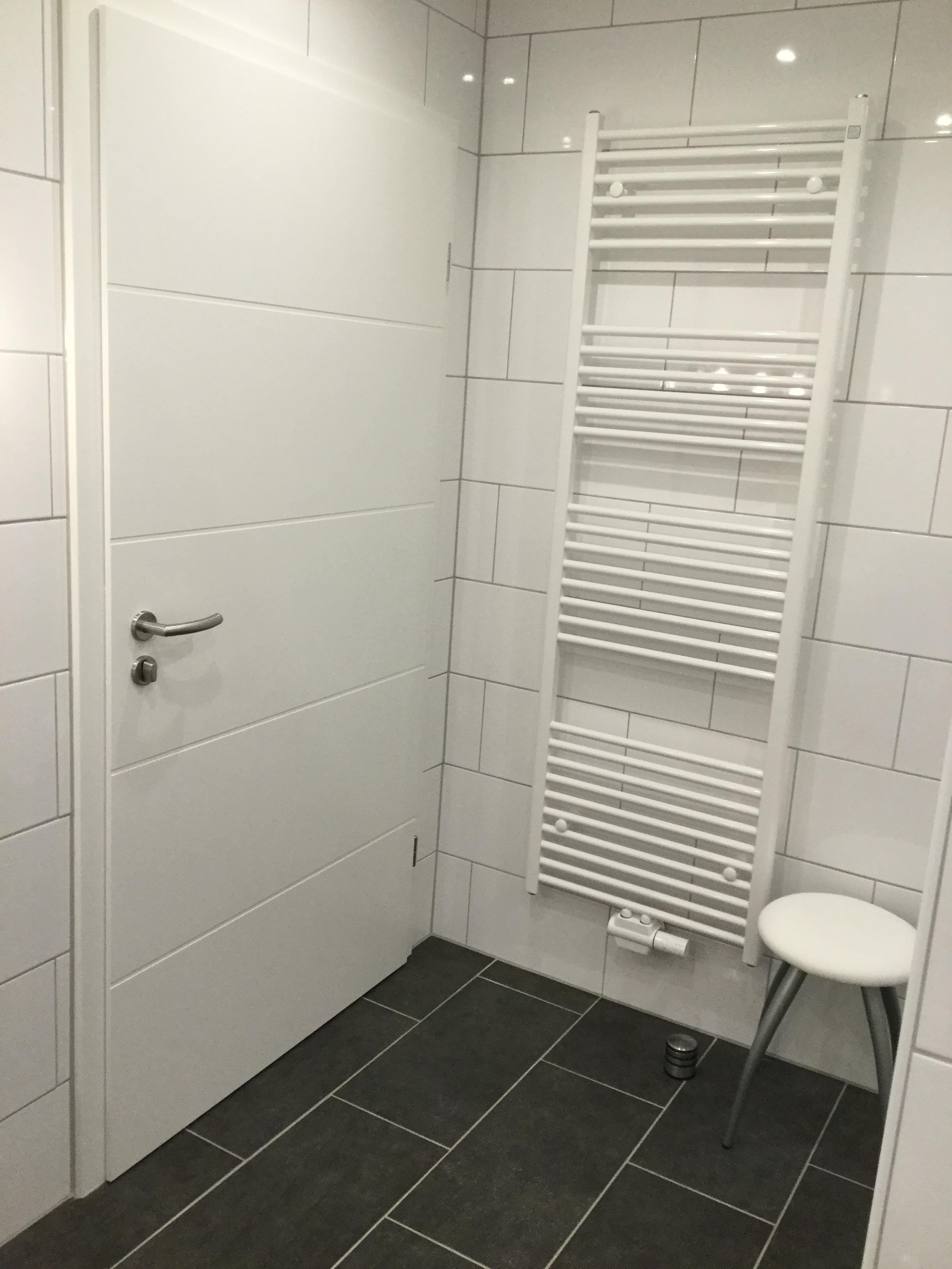 Das moderne Bad ist mit LED-Beleuchtung und ebenerdiger Dusche sowie großem Waschbecken ausgestattet.