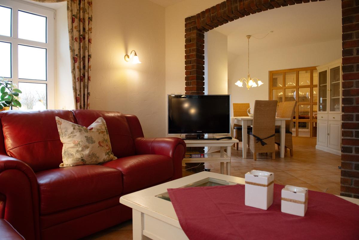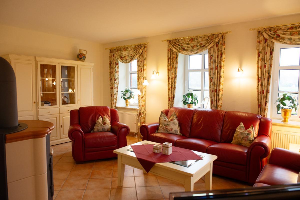 Schönes großes Wohnzimmer mit gemütlicher Ledergarnitur und wenn es mal kalt sein sollte, sorgt der Kamin für wohlige Wärme.